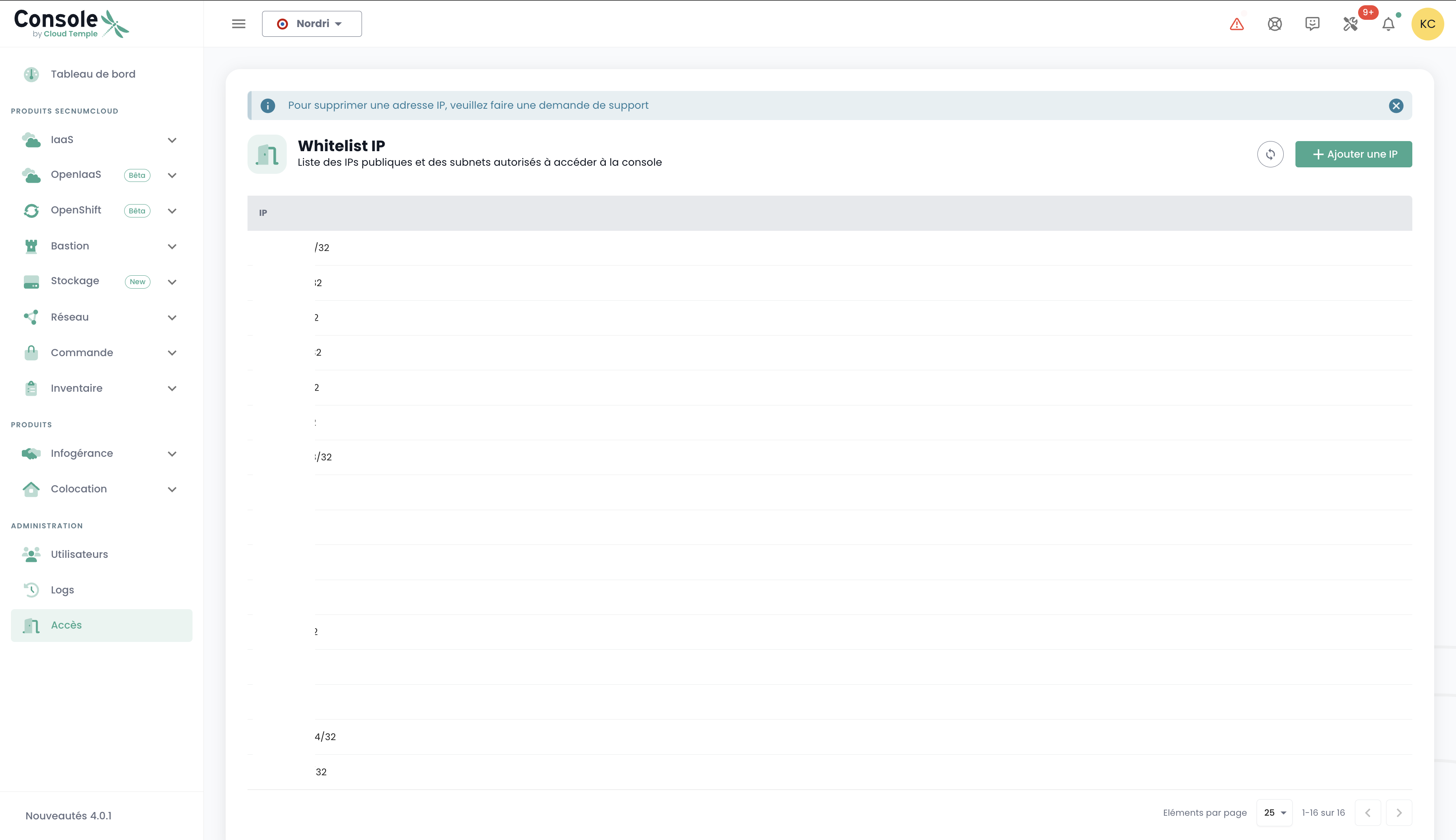 Note : La suppression d'un IP autorisée se fait par une demande de support dans la console Cloud Temple.