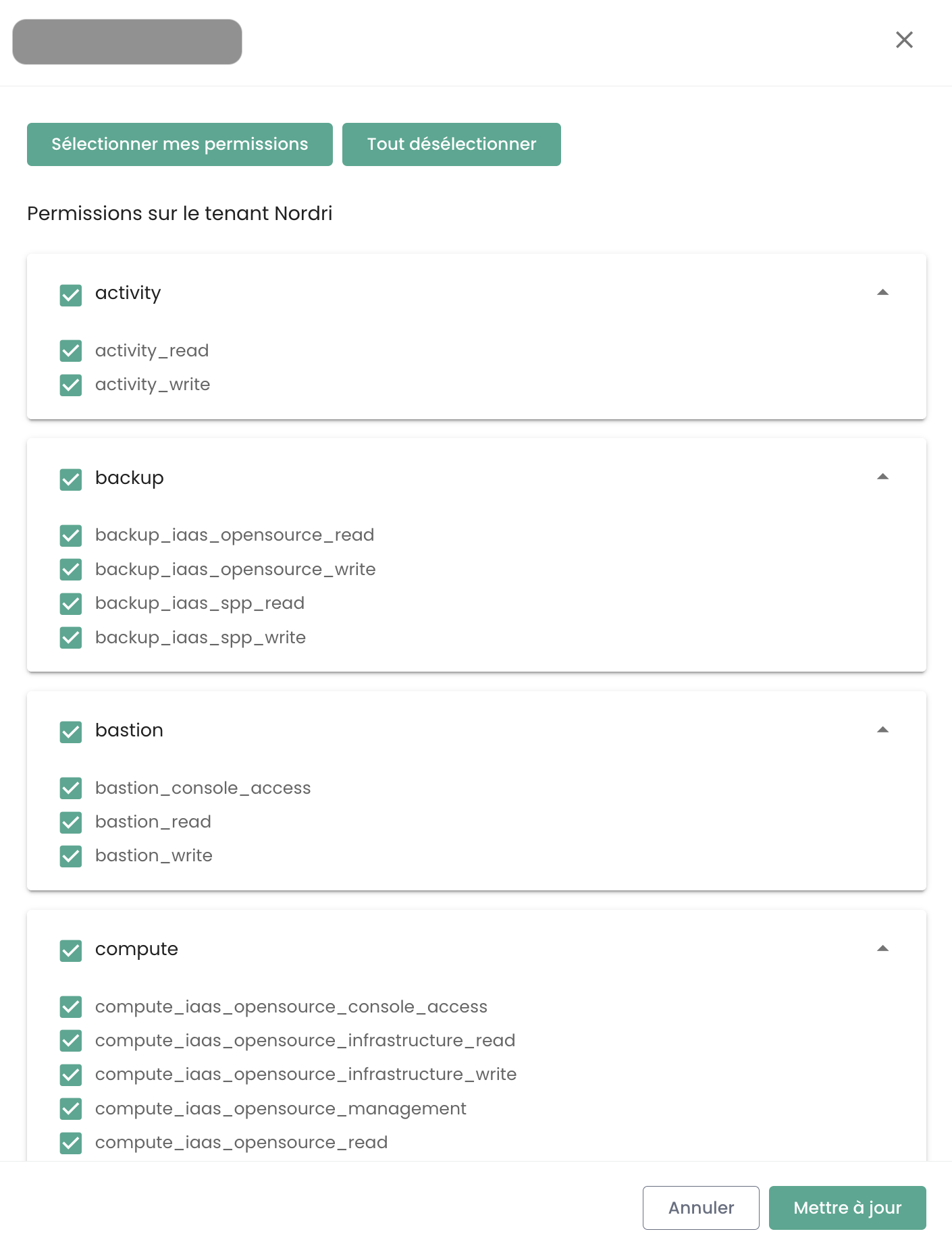 Pour ajouter une permission, vous avez besoin de posséder la permission 'iam_write' ainsi que la permission que vous souhaitez ajouter.