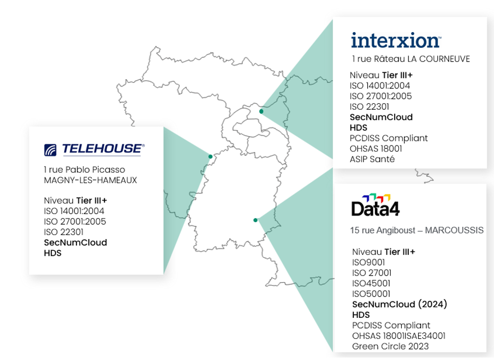 Somit ist es möglich, eine technische Architektur in der Region Paris zu definieren, wobei 3 physische Standorte verwendet werden, um eine hochverfügbare Plattform mit Quorum zu implementieren.