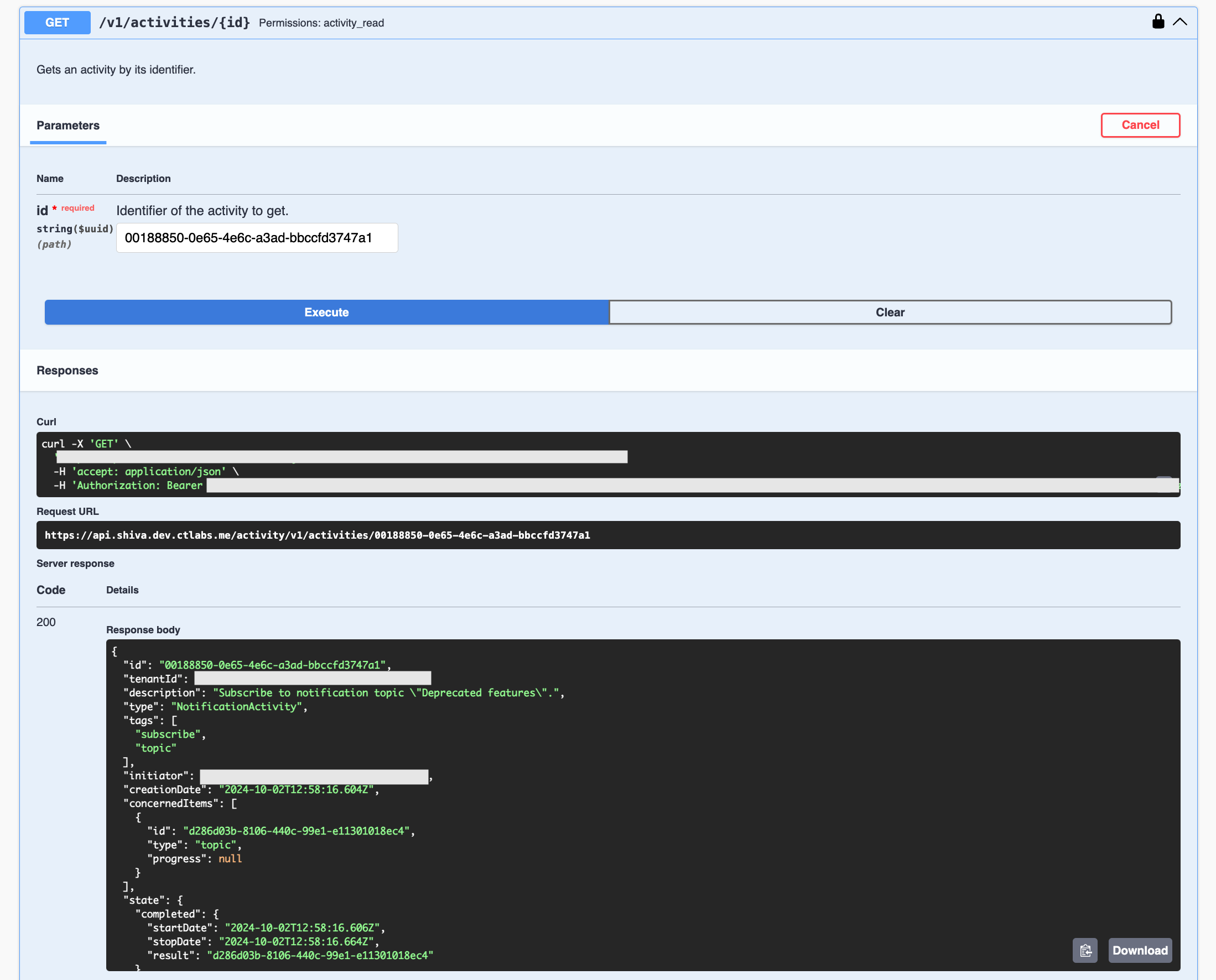 Once the identifier has been retrieved, it is possible to access the activity details using the Activity module's API: