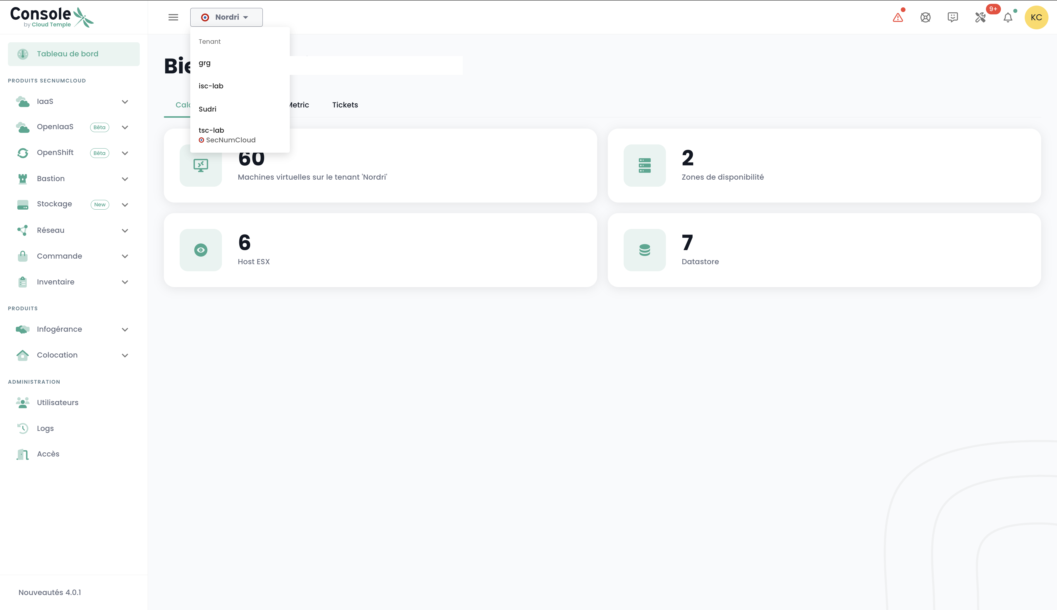 The selection of a tenant is performed from the main page of the Console: