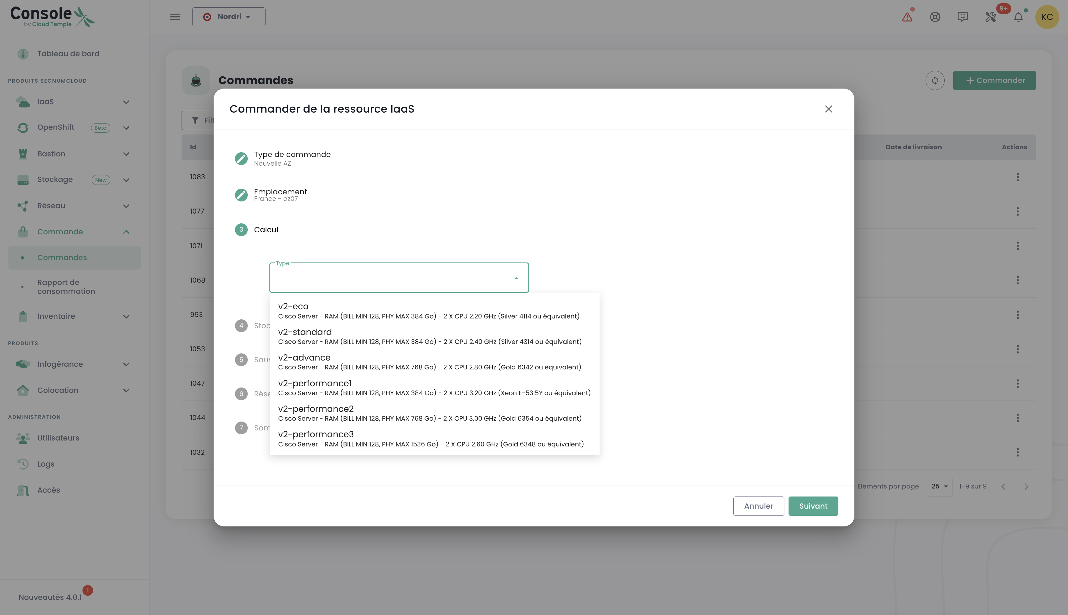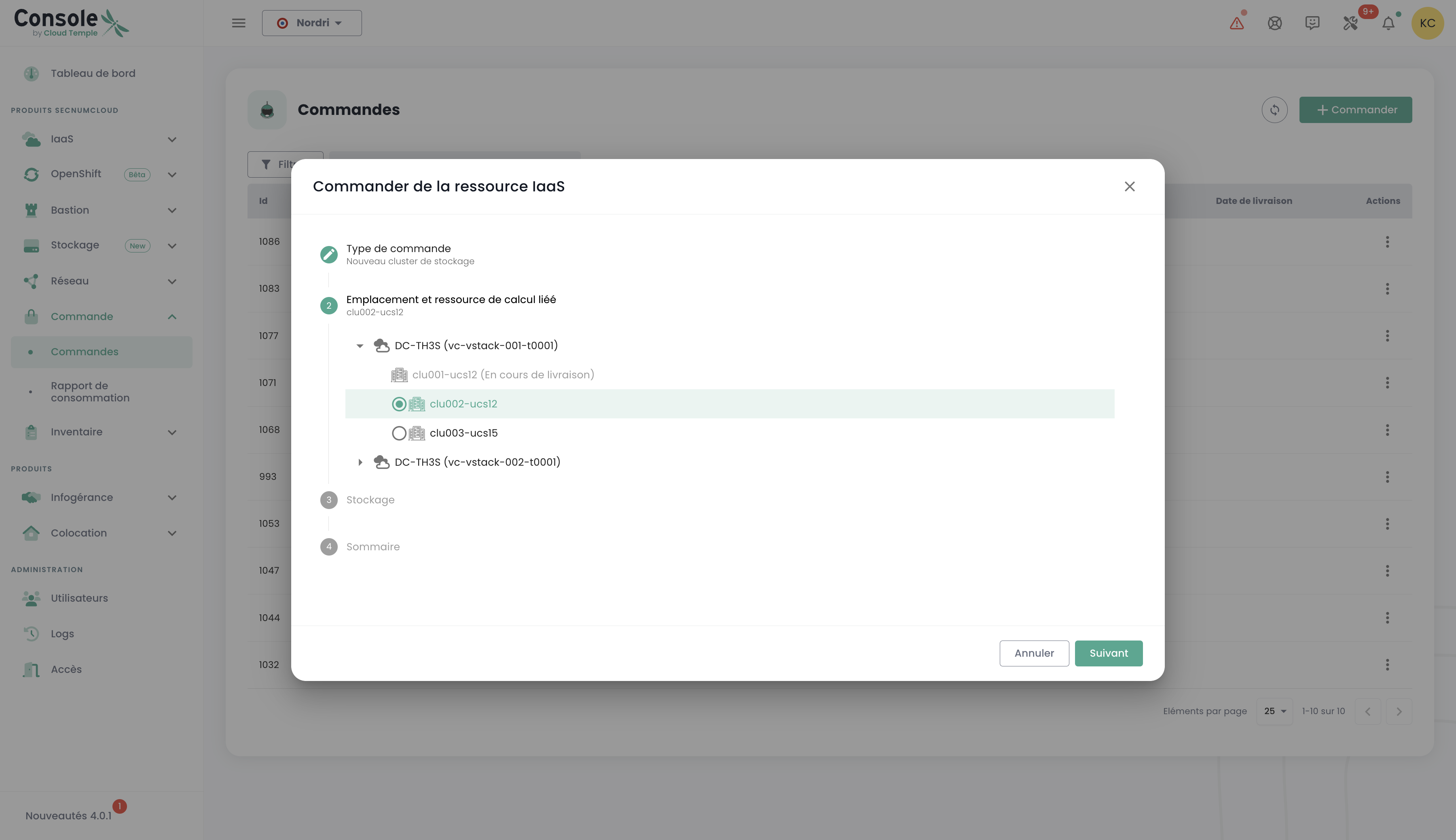In the "command" menu, proceed with ordering a new storage cluster for your environment by selecting the options that match your requirements in terms of capacity, performance, and redundancy. Choose the location: