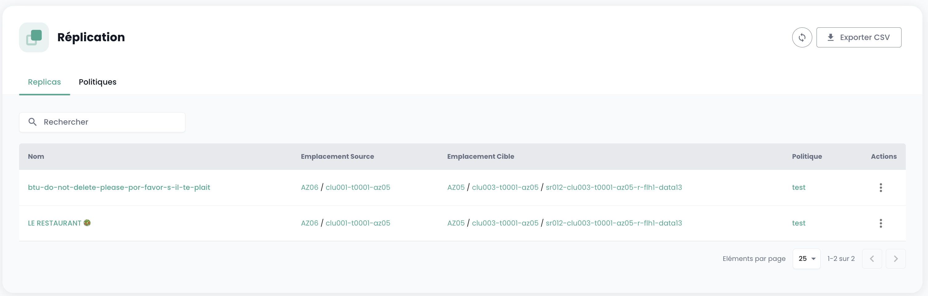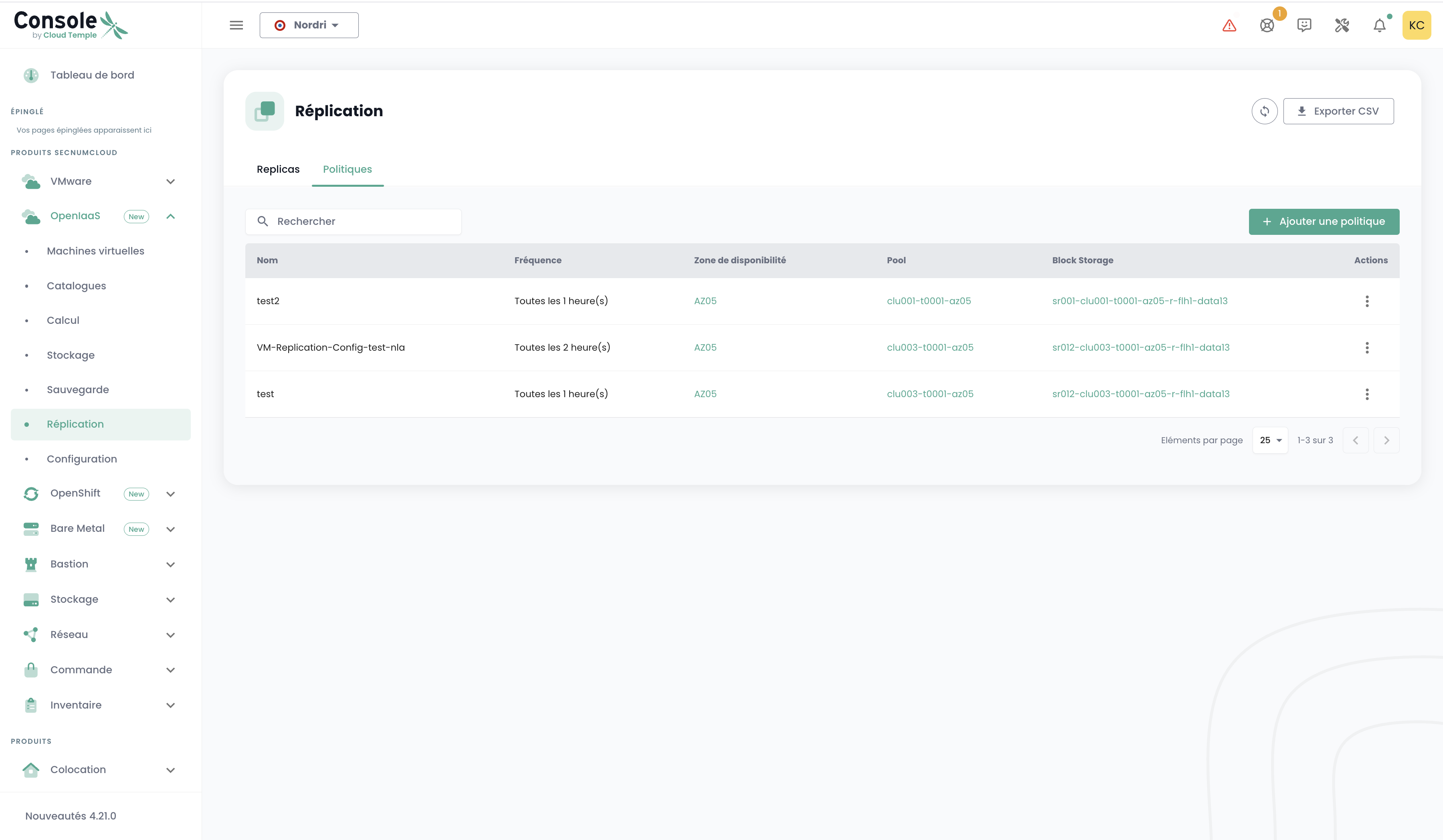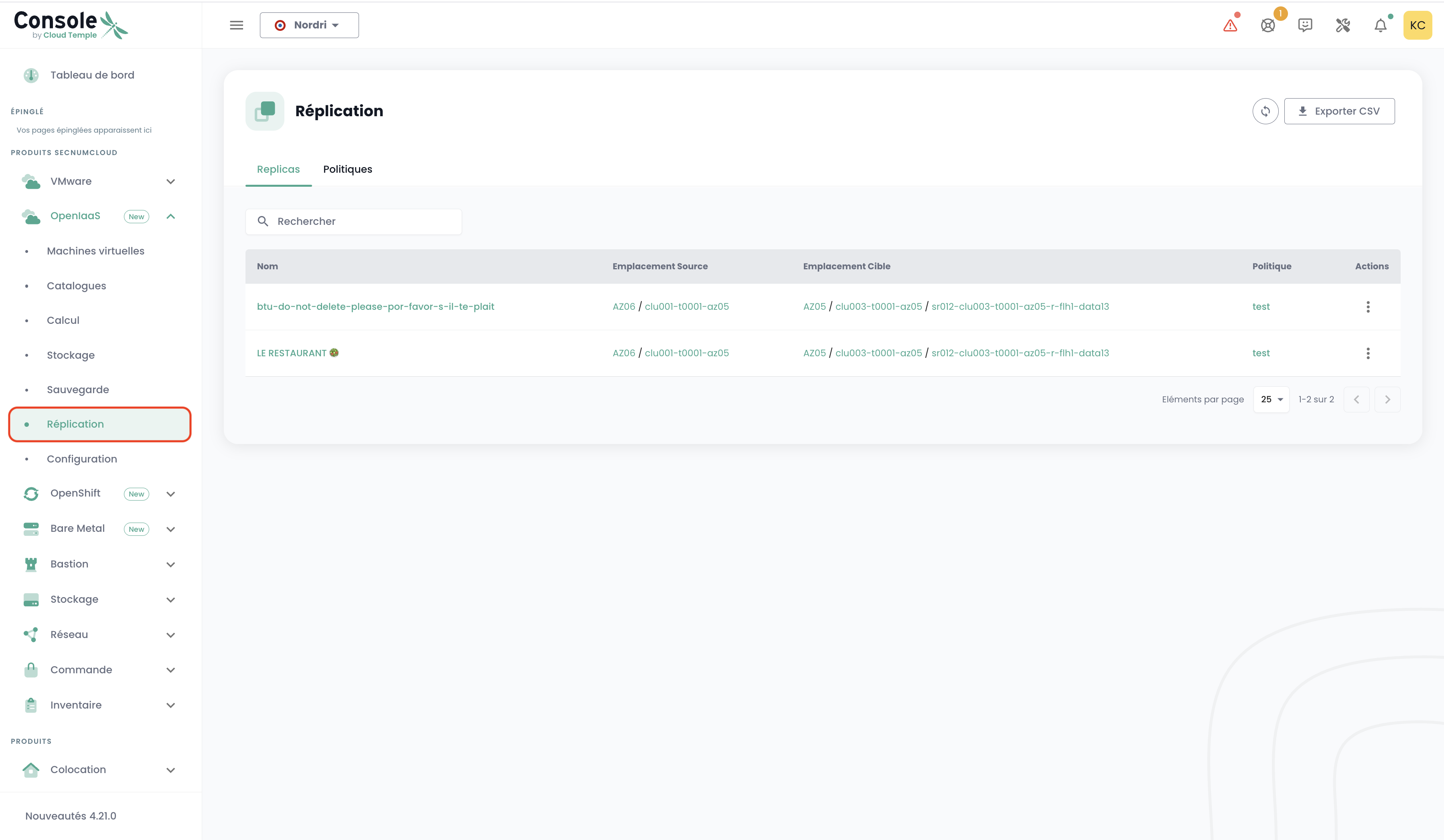 The replication management interface is available in the Console under the menu 'OpenIaaS' > 'Replication', located on the green bar on the left side of the screen.