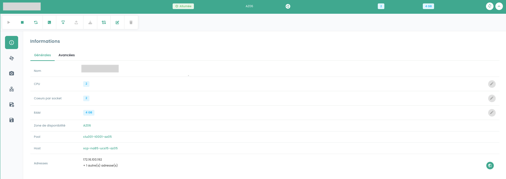 Im Register „Allgemein“ finden Sie detaillierte Informationen zur virtuellen Maschine, wie beispielsweise ihren physischen Standort (AZ, Pool, Host), den RAM, die CPU, die IP-Adressen und weitere Angaben.