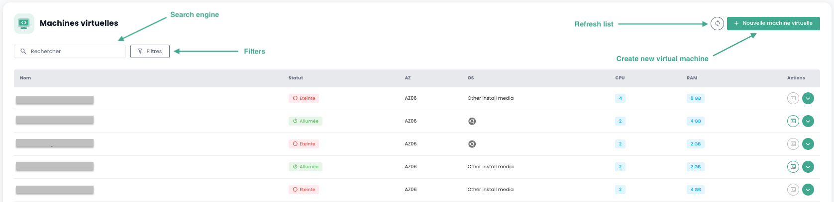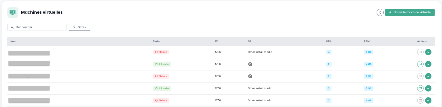 In der Sektion 'Virtuelle Maschinen' haben Sie Zugriff auf die Liste Ihrer auf Ihrem vertrauenswürdigen Cloud-System gehosteten virtuellen Maschinen.