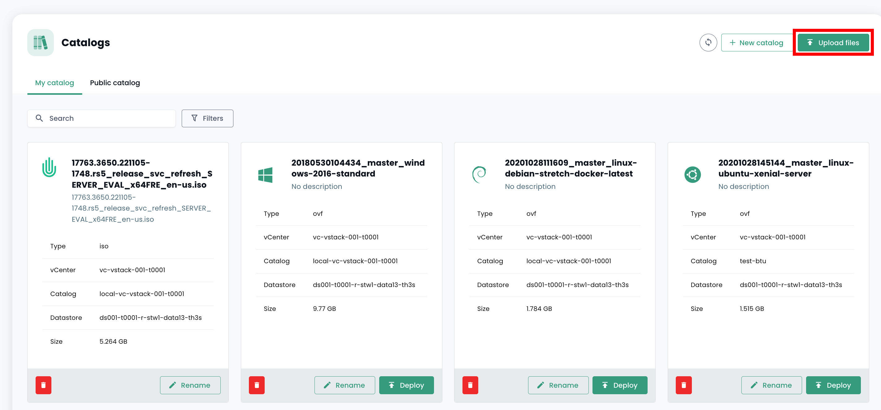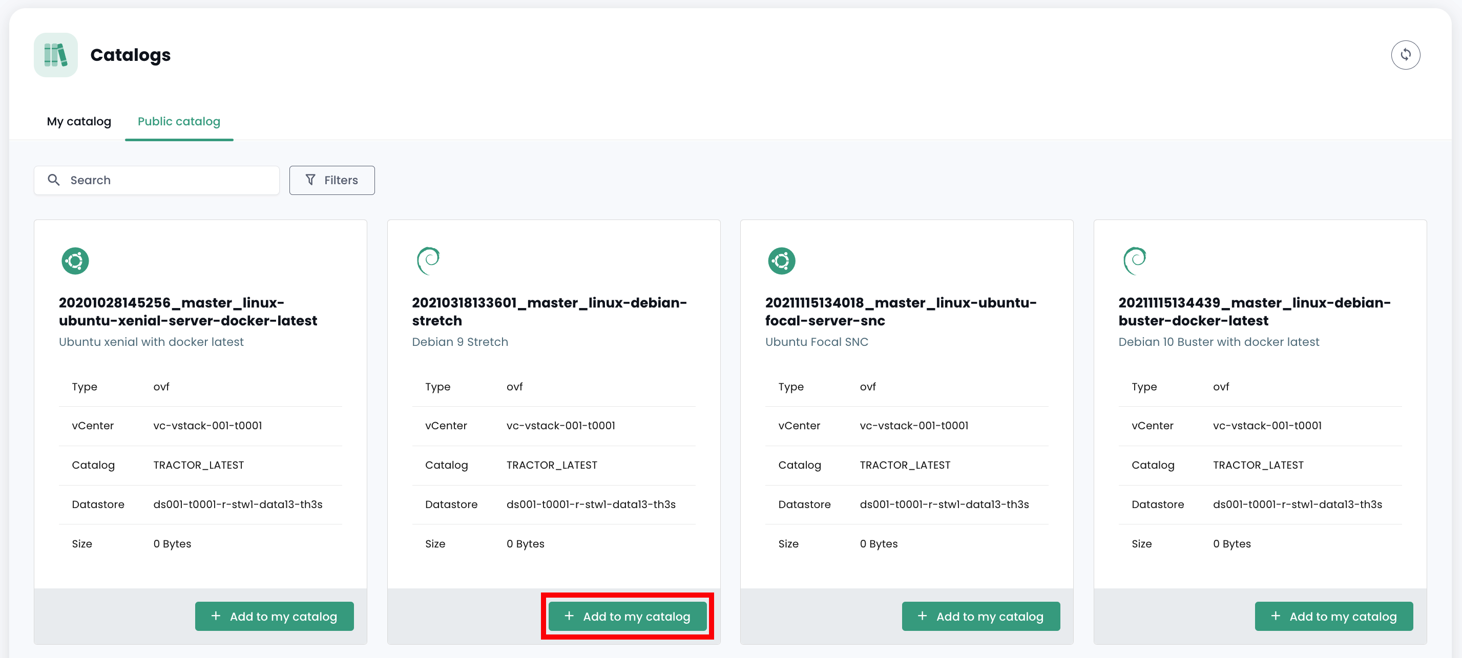 In the "Public catalog" tab, click the "Add to my catalog" button of the desired template to import it into your private catalog. It should then appear in your private catalog.