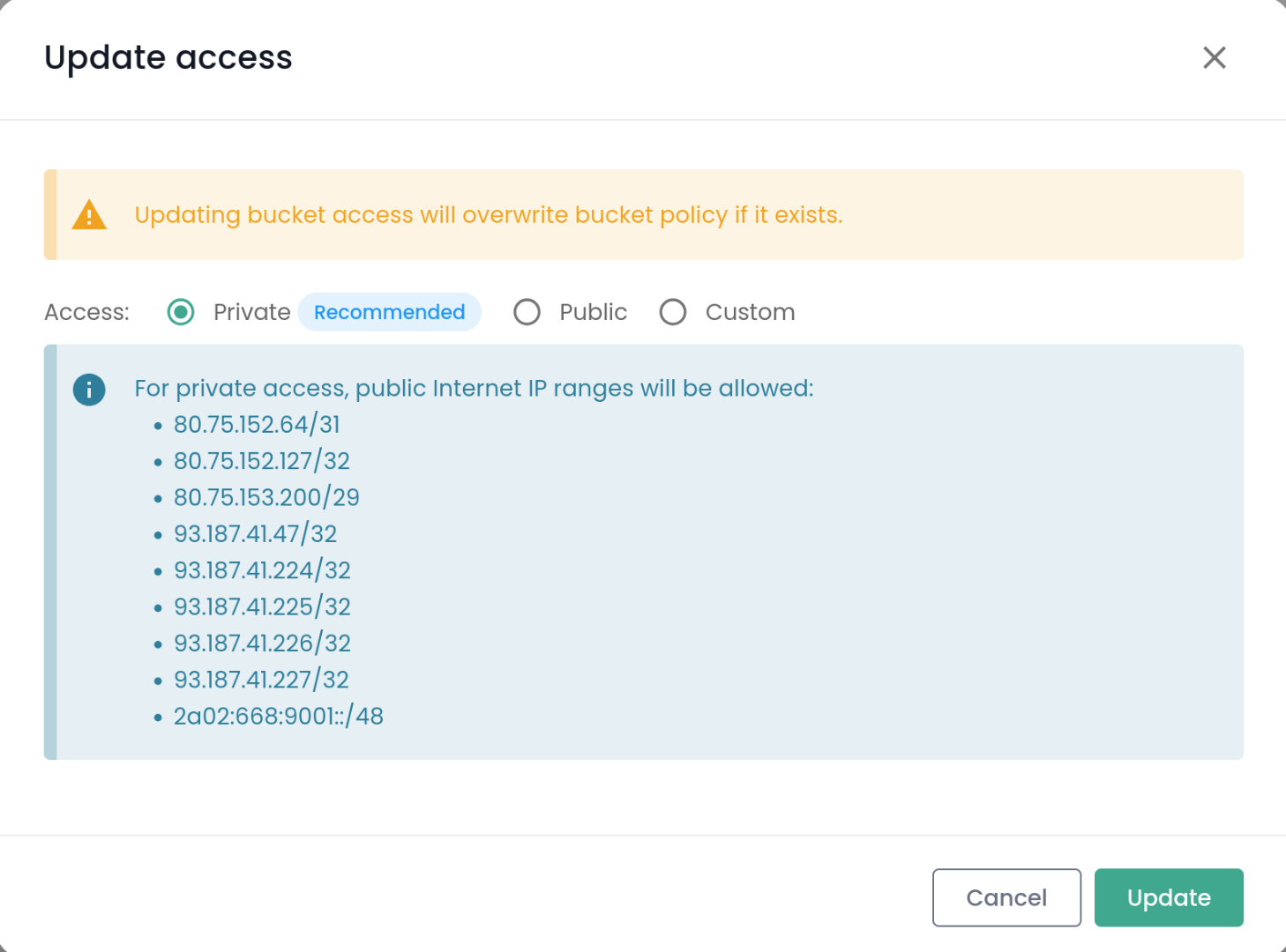 The bucket configuration interface offers three access management modes according to the desired IP restriction type: