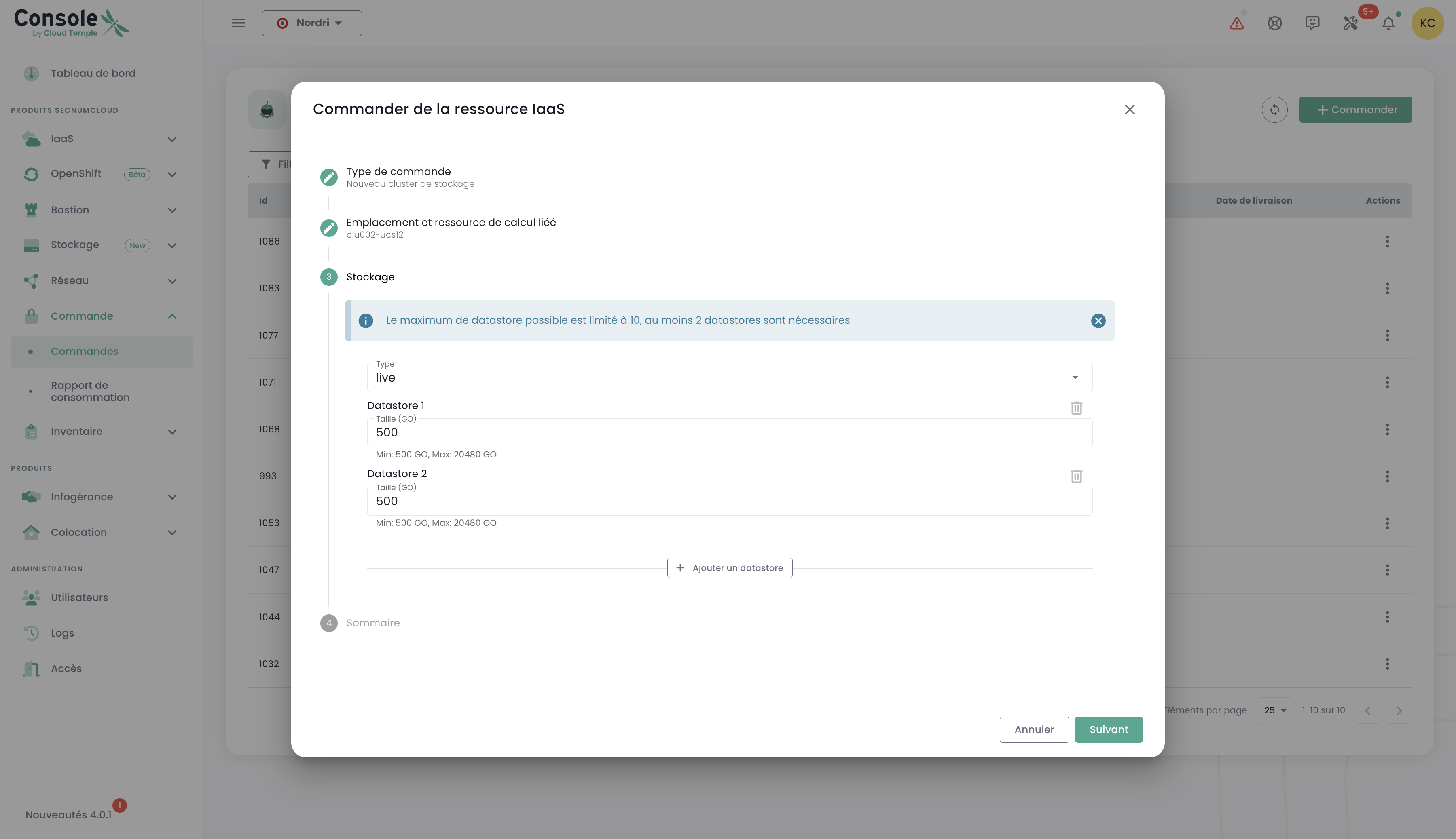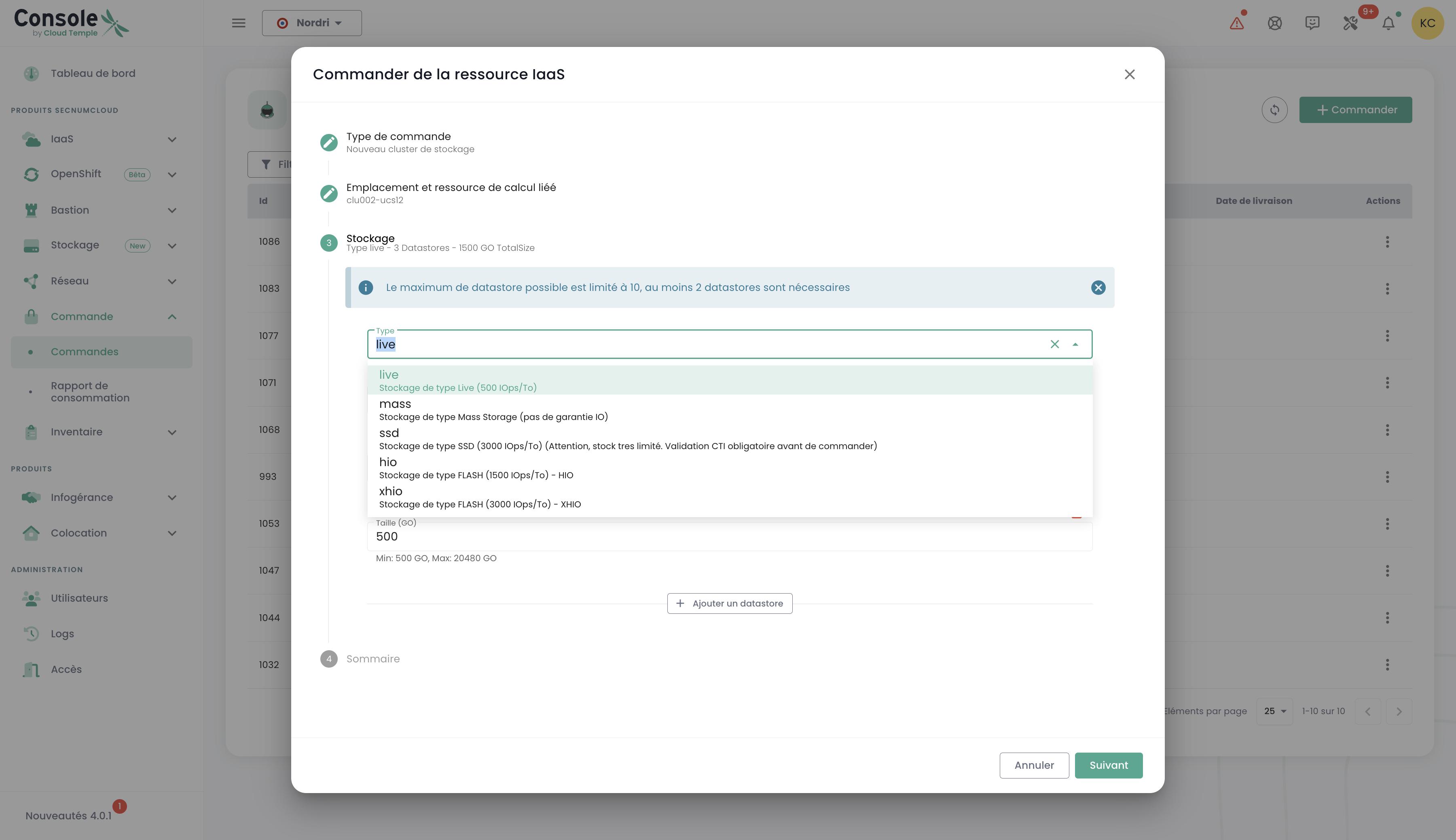 In the "command" menu, proceed with ordering a new storage cluster for your environment by selecting options that match your requirements in terms of capacity, performance, and redundancy. Choose the location: