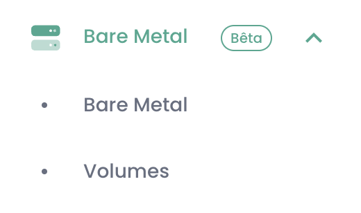 Once the subscription is activated and permissions are configured, a new menu titled Bare Metal appears in the Cloud Temple console. This menu contains two main submenus: Bare Metal and Volumes.