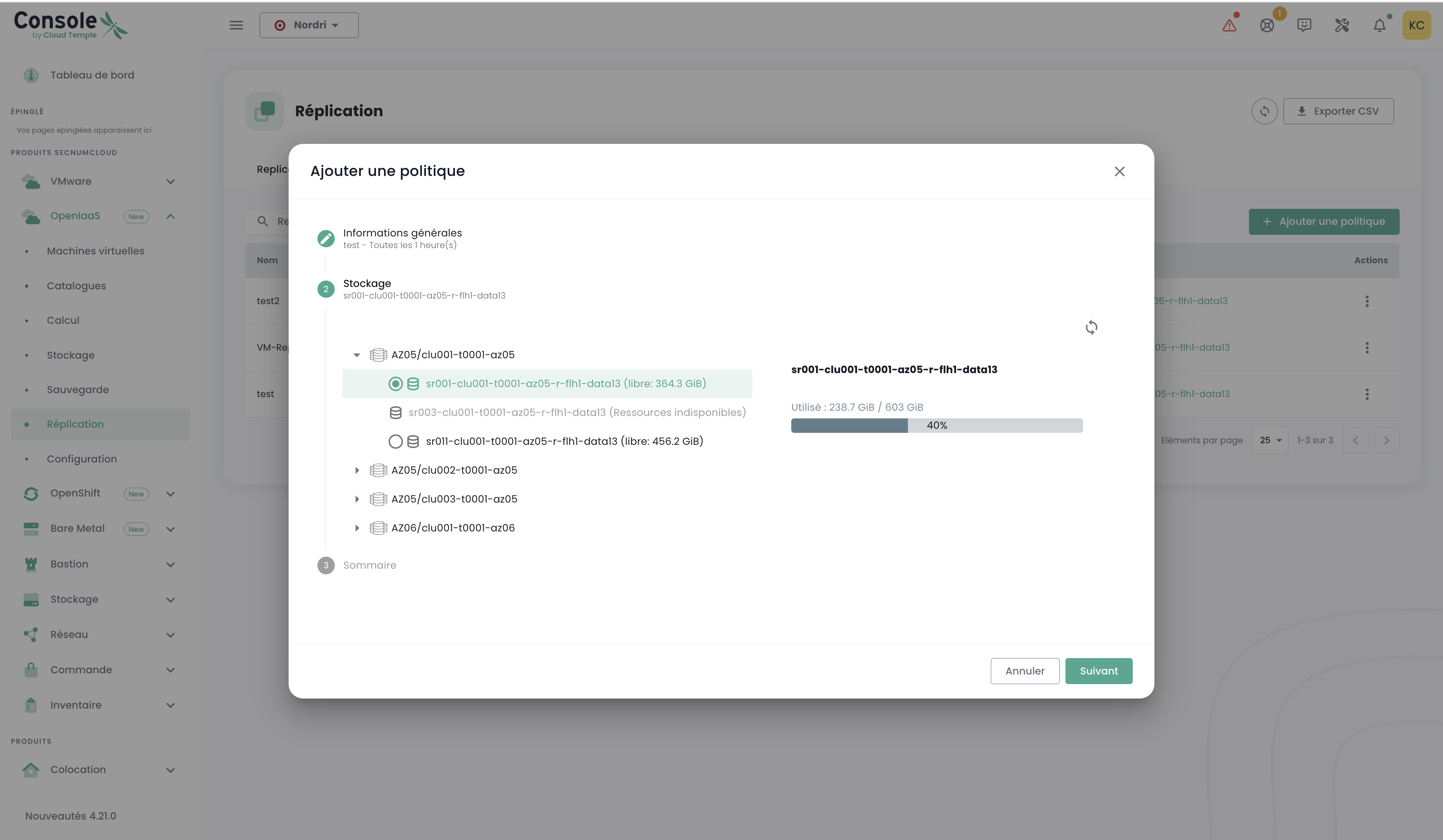 The replication management interface is available in the Console under the 'OpenIaaS' > 'Replication' menu, located on the green bar on the left side of the screen.