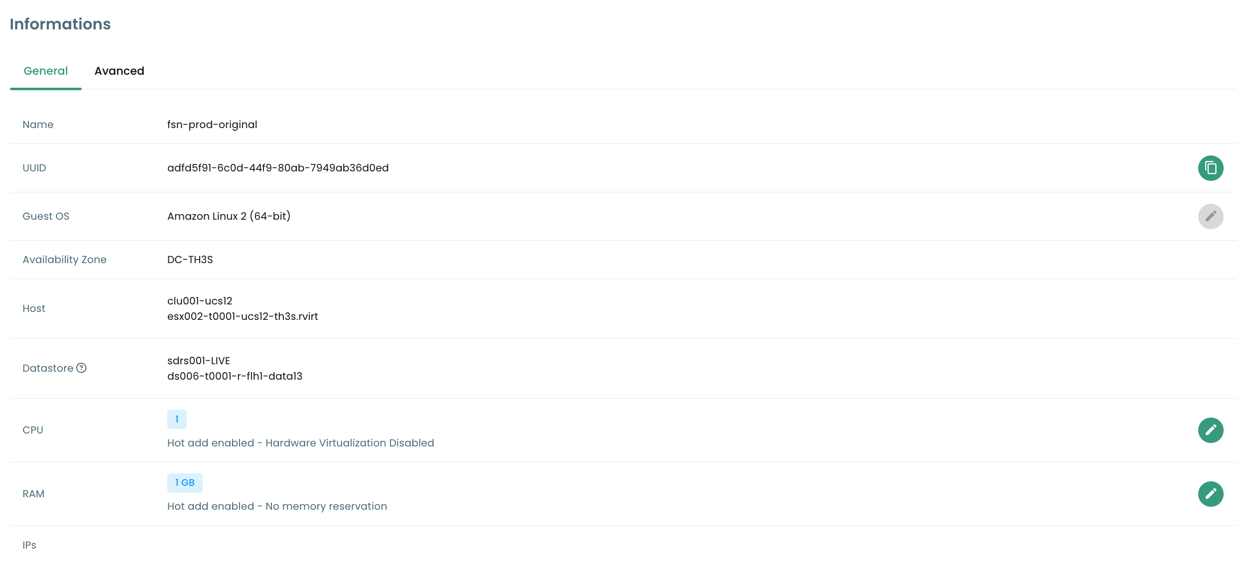 In the 'General Information' tab, you find detailed information about your virtual machine, such as its OS, physical location (datacenter, datastore, etc.), RAM, CPU, IP addresses, logs, and more.