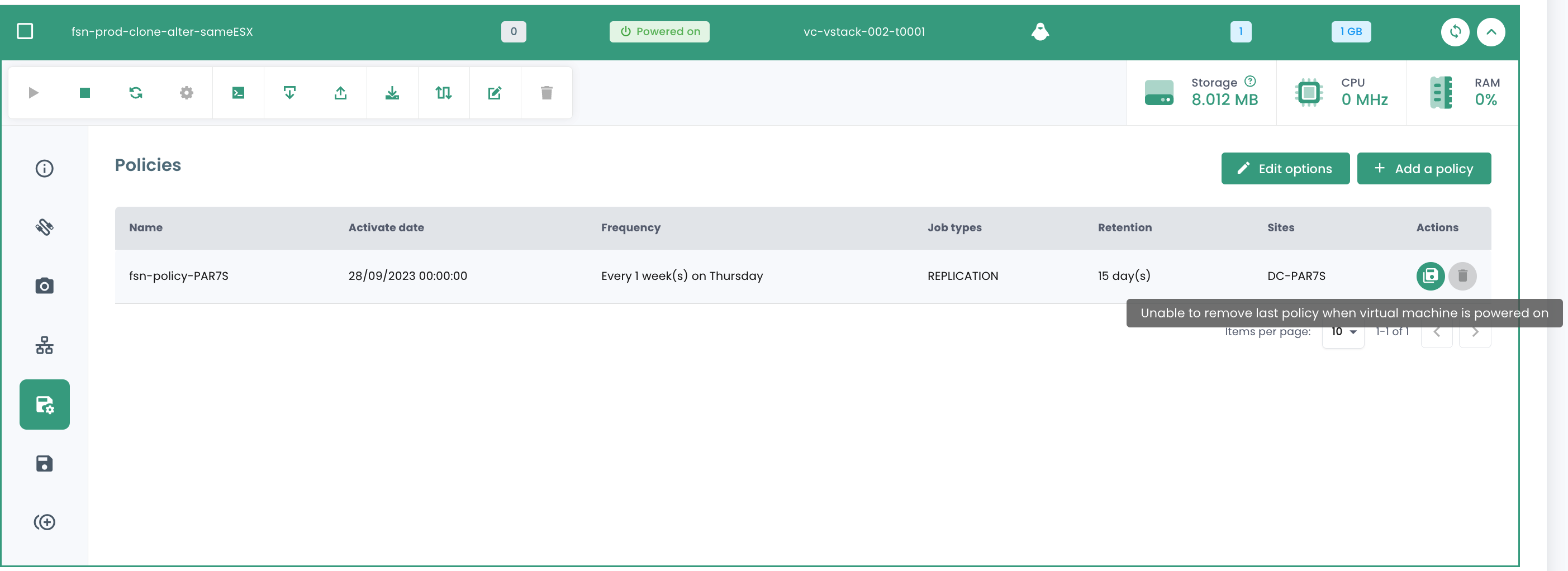 You can also convert a virtual machine into a template and export it to the catalog. To do so, select a virtual machine and use the 'Clone' action button: