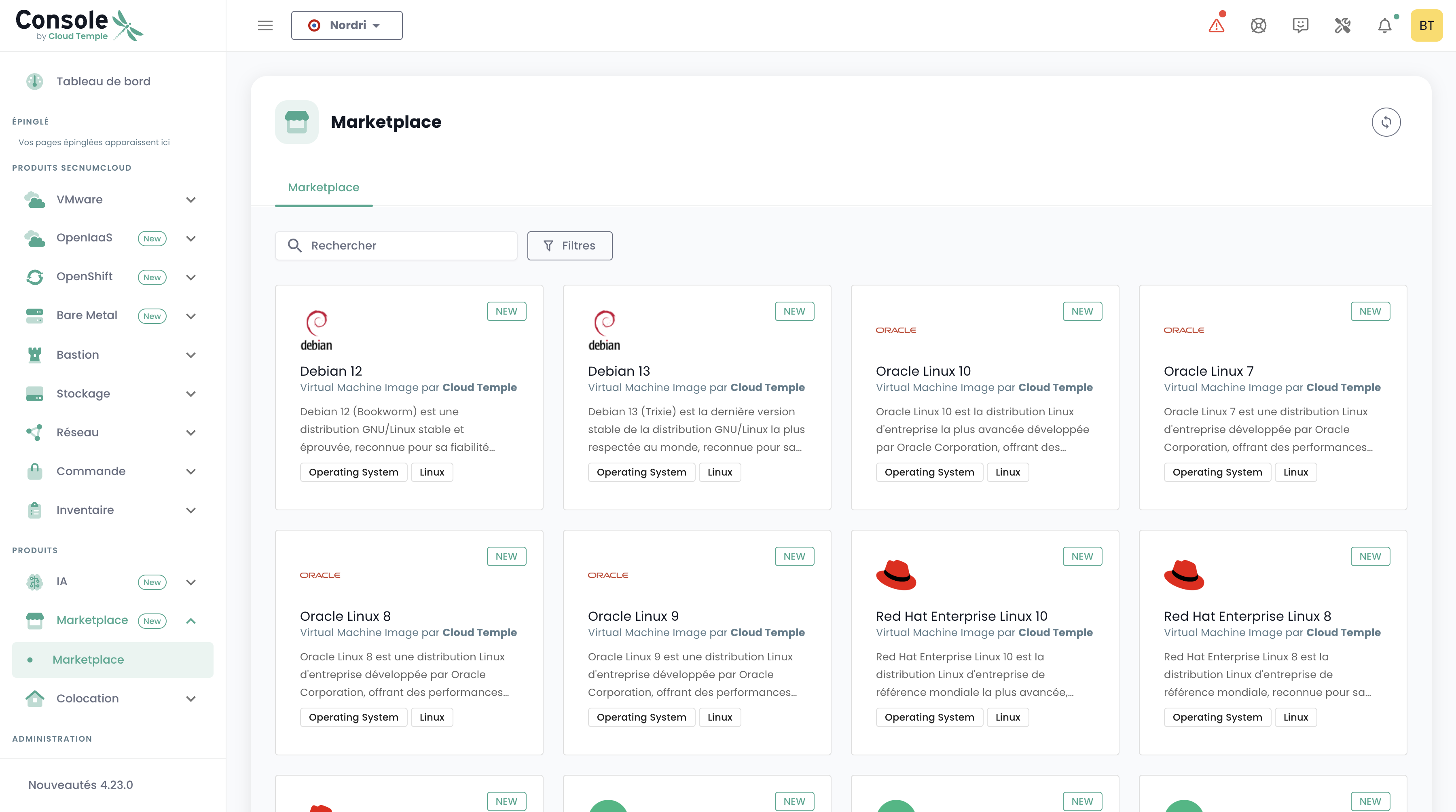 Once logged into the Cloud Temple console, you can access the Marketplace in several ways: