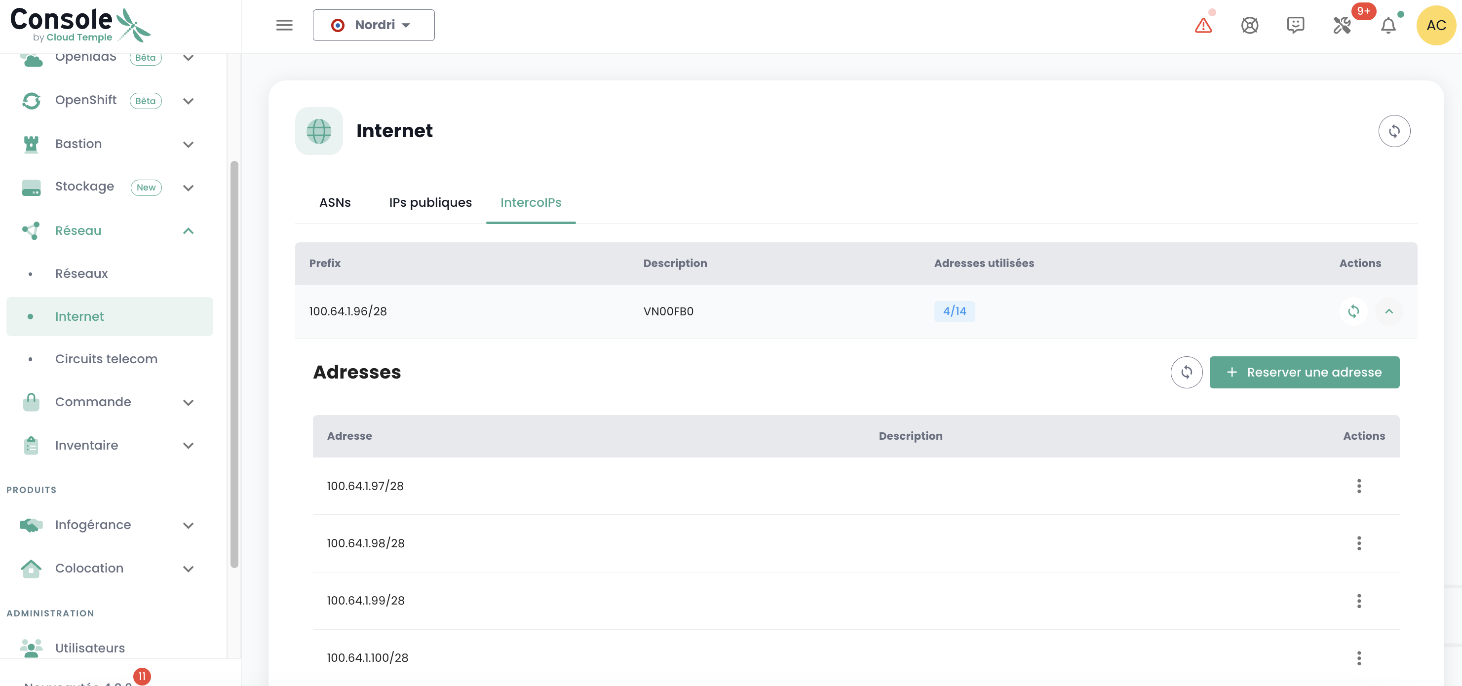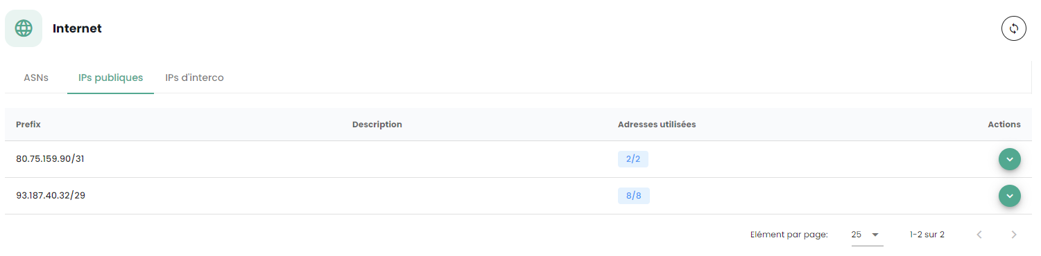 You must also have a public IP address range whose scope relates to your needs. The reserved address range is indicated in the Cloud Temple console under Network → Internet → Public IPs. Here is an example: