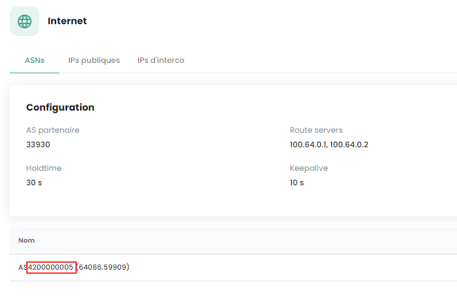 You must have the necessary information to establish the BGP session with the backbone. This data is available in the Cloud Temple console, in the Network → Internet → ASNs section: