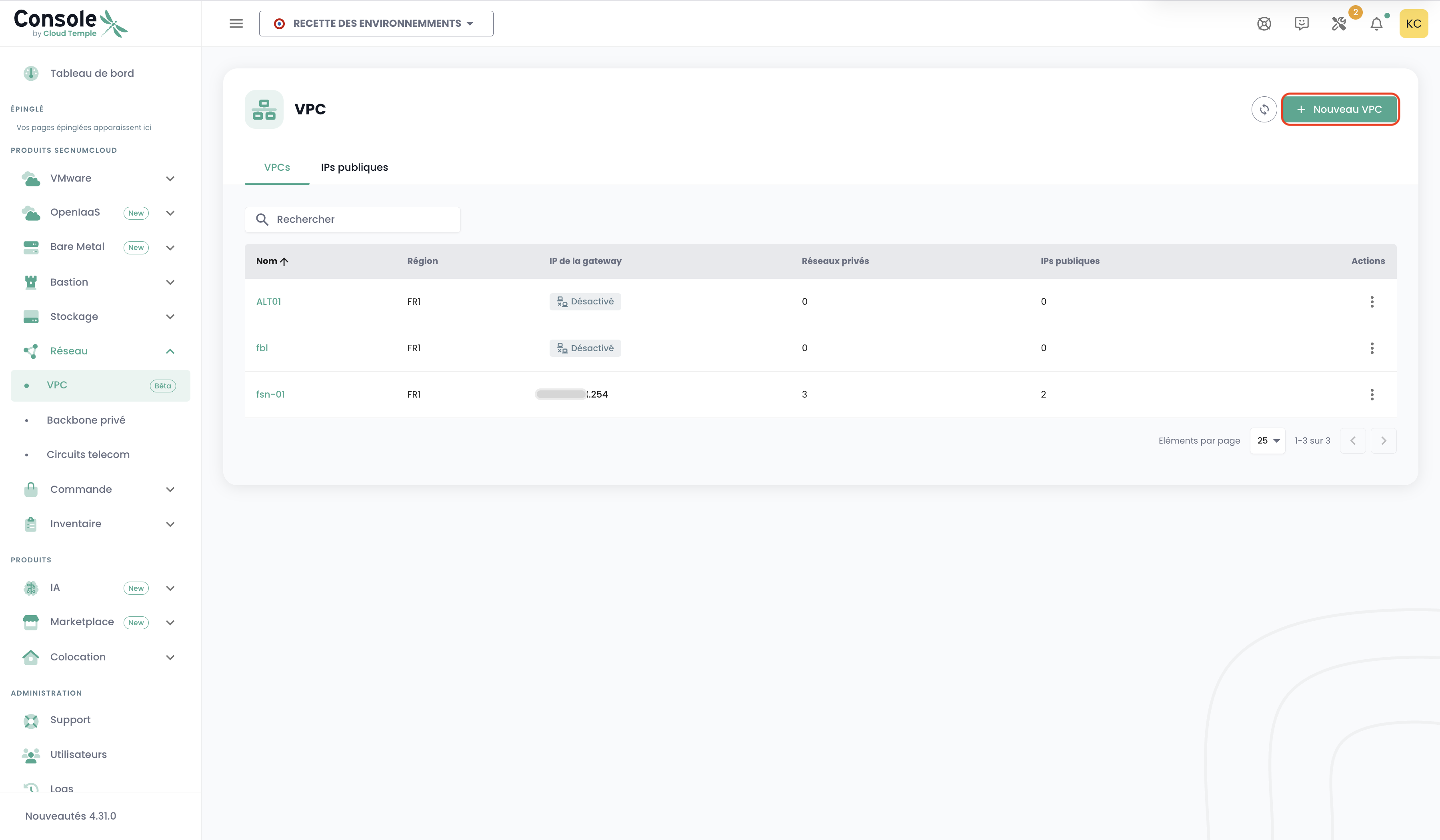 Note: The Public IPs list at the root of the VPC menu displays all public IPs (assigned or unassigned). The Public IPs tab within a VPC's details allows you to manage only those IPs assigned to that specific VPC (requires the gateway to be active).