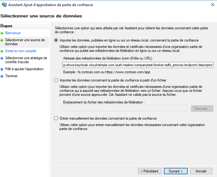 El equipo de soporte de Cloud Temple le enviará una URL que tendrá un aspecto similar a este: https://keycloak-shiva.cloud-temple.com/auth/realms/companytest/broker/adfs_test/endpoint/descriptor