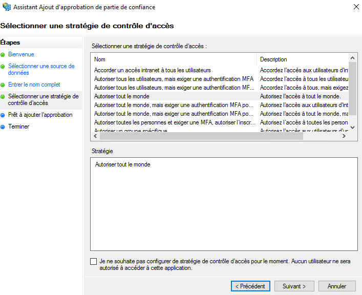 Por defecto, permitimos a todos, pero es posible seleccionar "Permitir un grupo específico" para elegir el o los grupos que tendrán acceso a los servicios de la consola a través de ADFS.