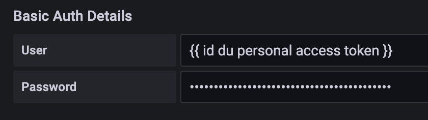 En la parte "Detalles de autenticación básica", configurar el nombre de usuario y contraseña utilizando respectivamente el id y el secreto de un Token de acceso personal con el permiso metrics_read.