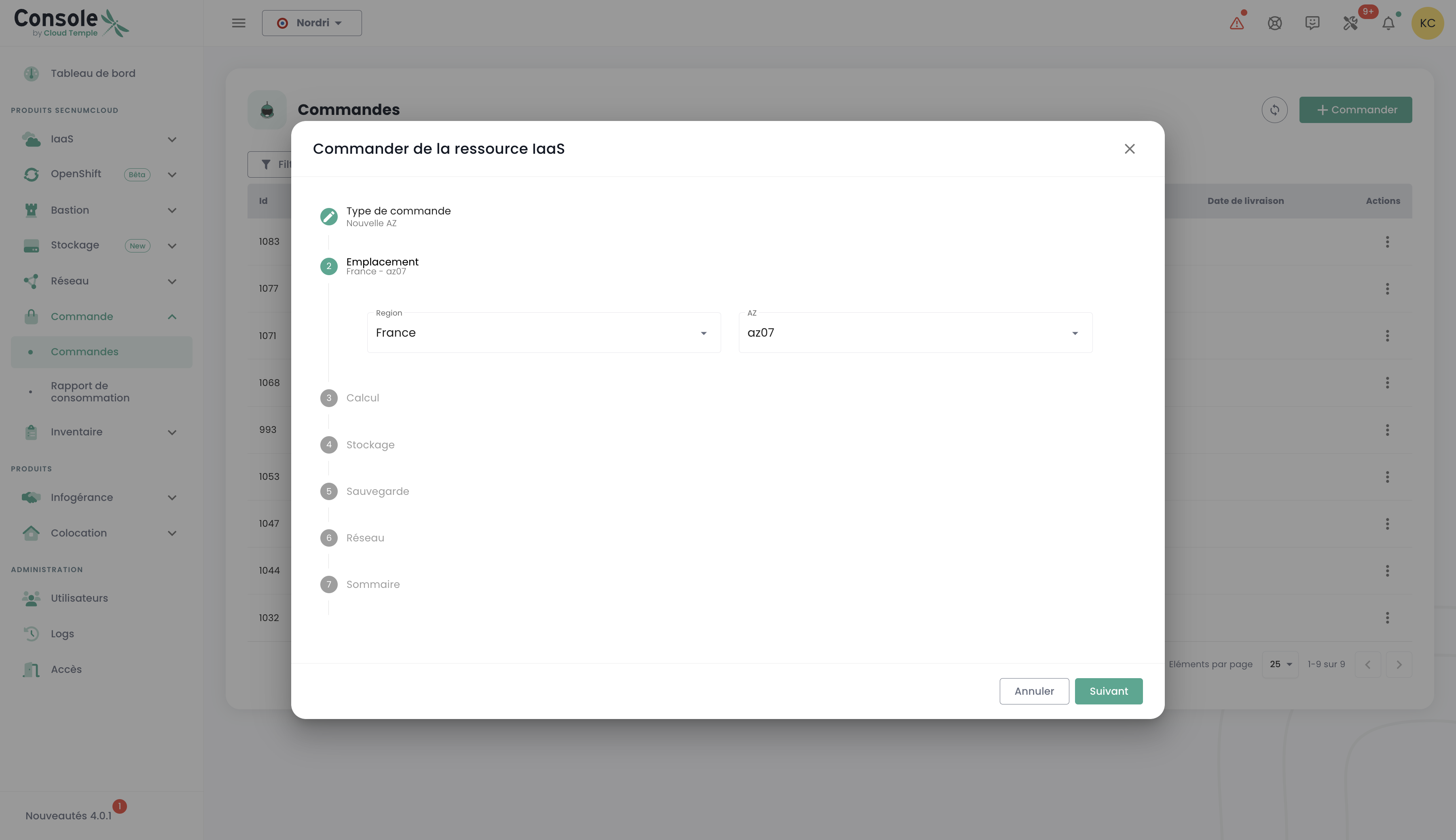 Comience seleccionando el ubicación deseada, eligiendo primero la región geográfica y luego la zona de disponibilidad (AZ) correspondiente entre las disponibles. Esta etapa permite adaptar el despliegue de sus recursos según la ubicación y los requisitos de su infraestructura: