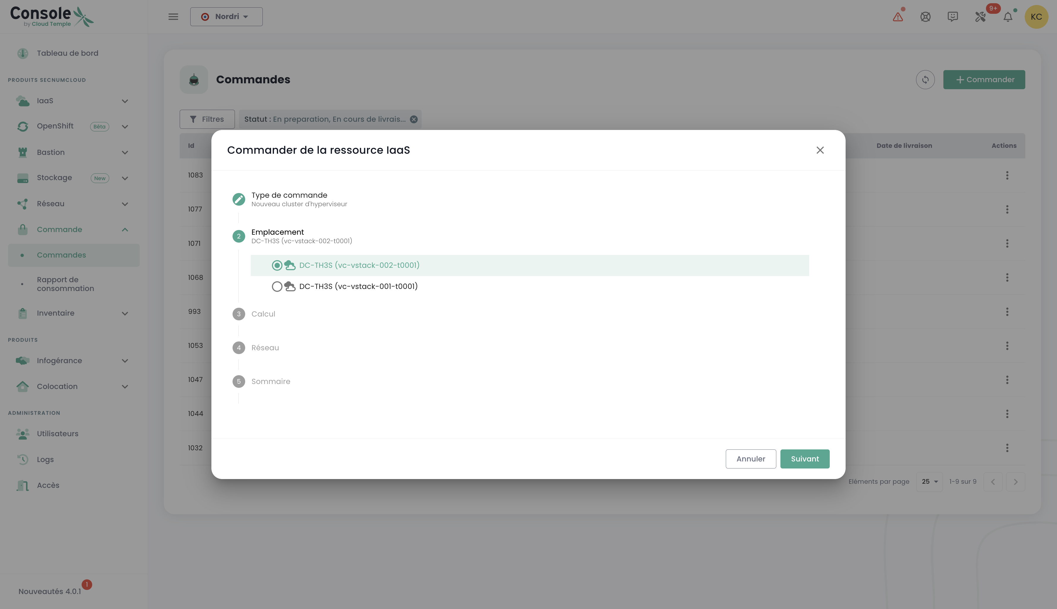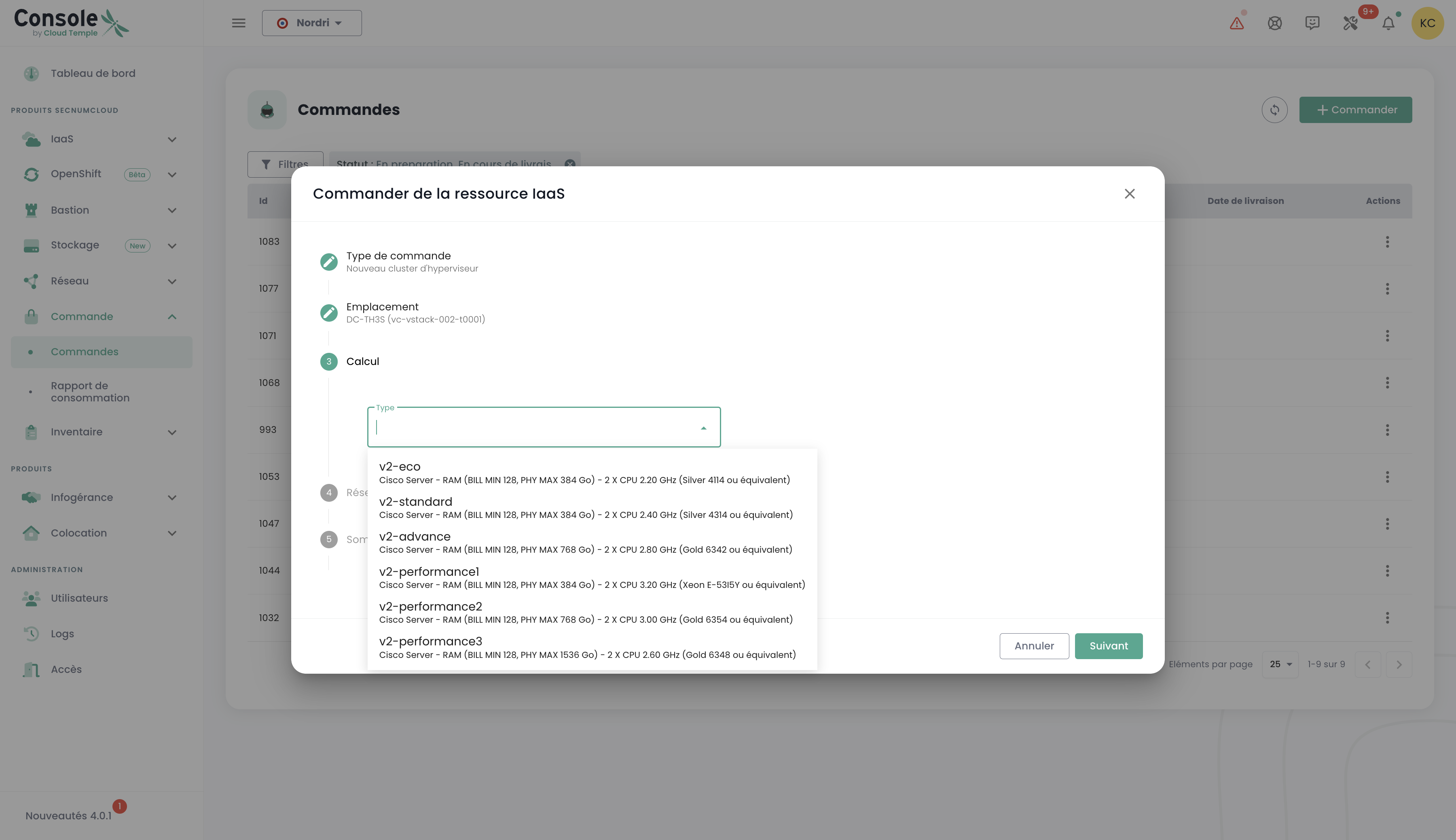 En el menú "comando", realice el pedido de un nuevo clúster de almacenamiento para su entorno seleccionando las opciones que se ajusten a sus necesidades en cuanto a capacidad, rendimiento y redundancia. Seleccione la ubicación: