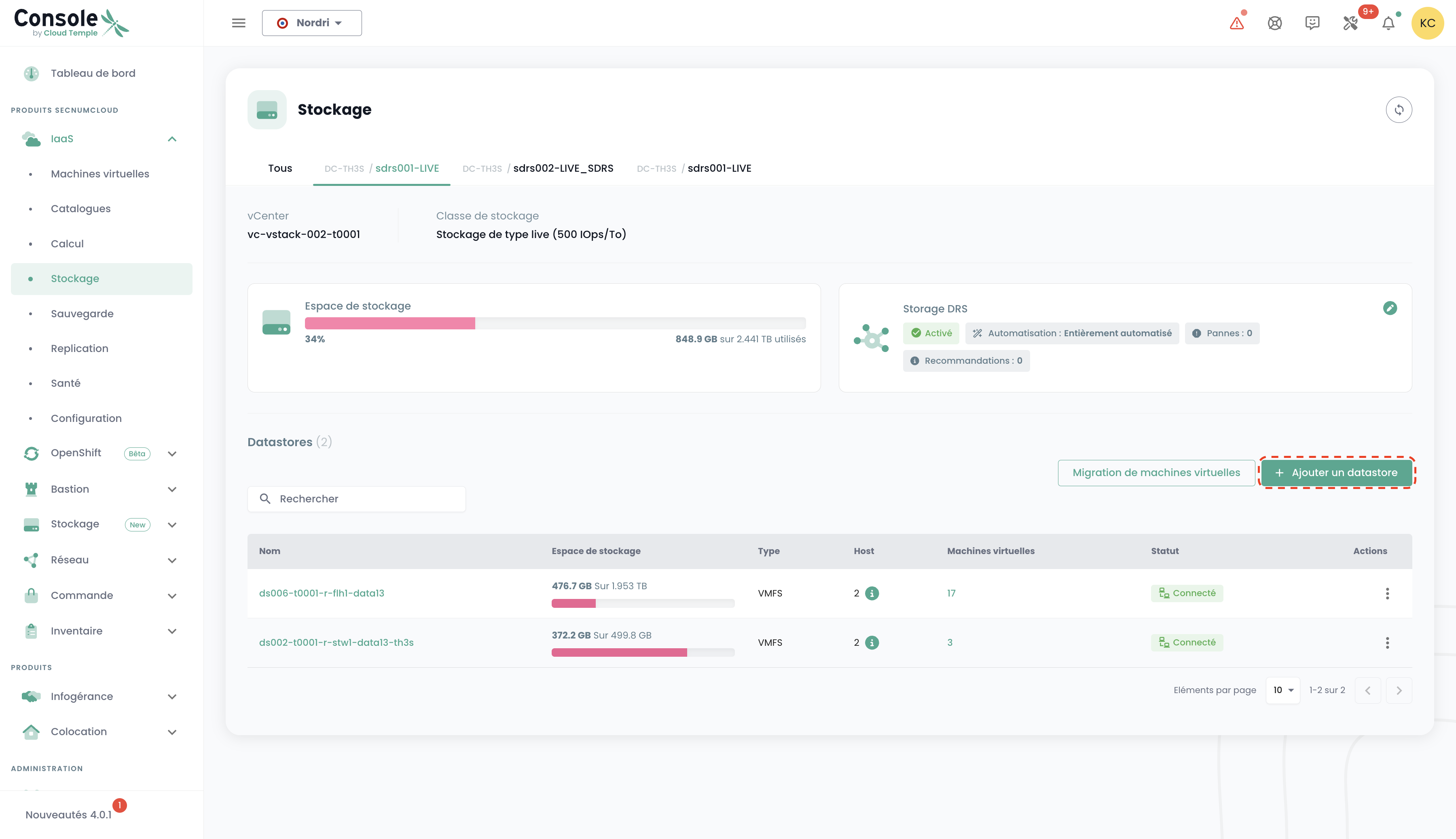 Choose the SDRS cluster that matches the performance characteristics you require, and click the 'Add a datastore' button located in the table displaying the list of datastores.