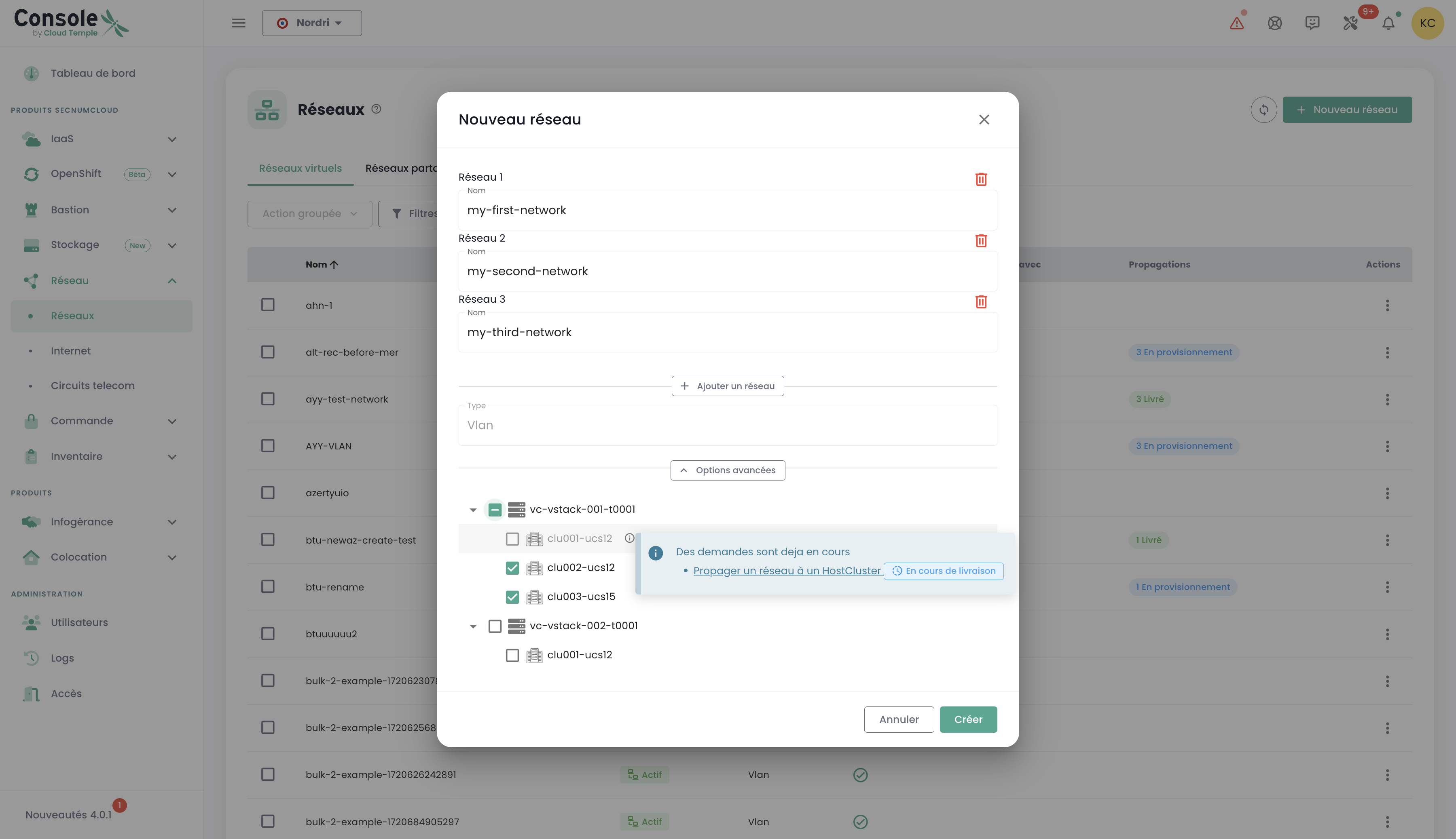 La solicitud de una nueva red y las decisiones sobre el compartimiento entre sus inquilinos se realizan en el menú 'Red' de la barra verde situada a la izquierda de la pantalla. Las redes se crearán primero, y luego se generará una solicitud independiente para propagarlas. Puede seguir el progreso de las solicitudes en curso accediendo al panel "Solicitud" en el menú, o haciendo clic en las etiquetas de información que le redirigirán a las solicitudes activas o en proceso de tratamiento.