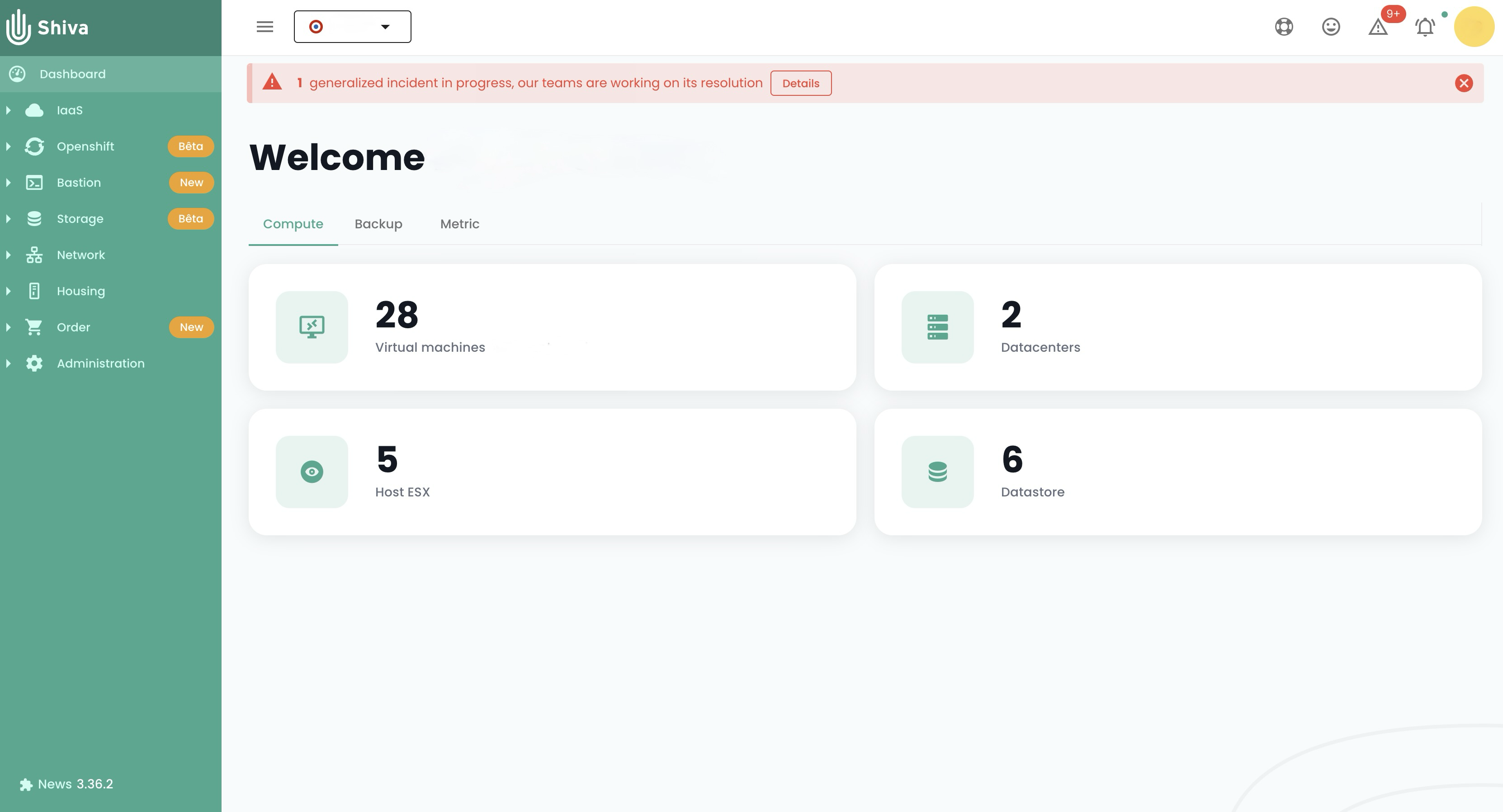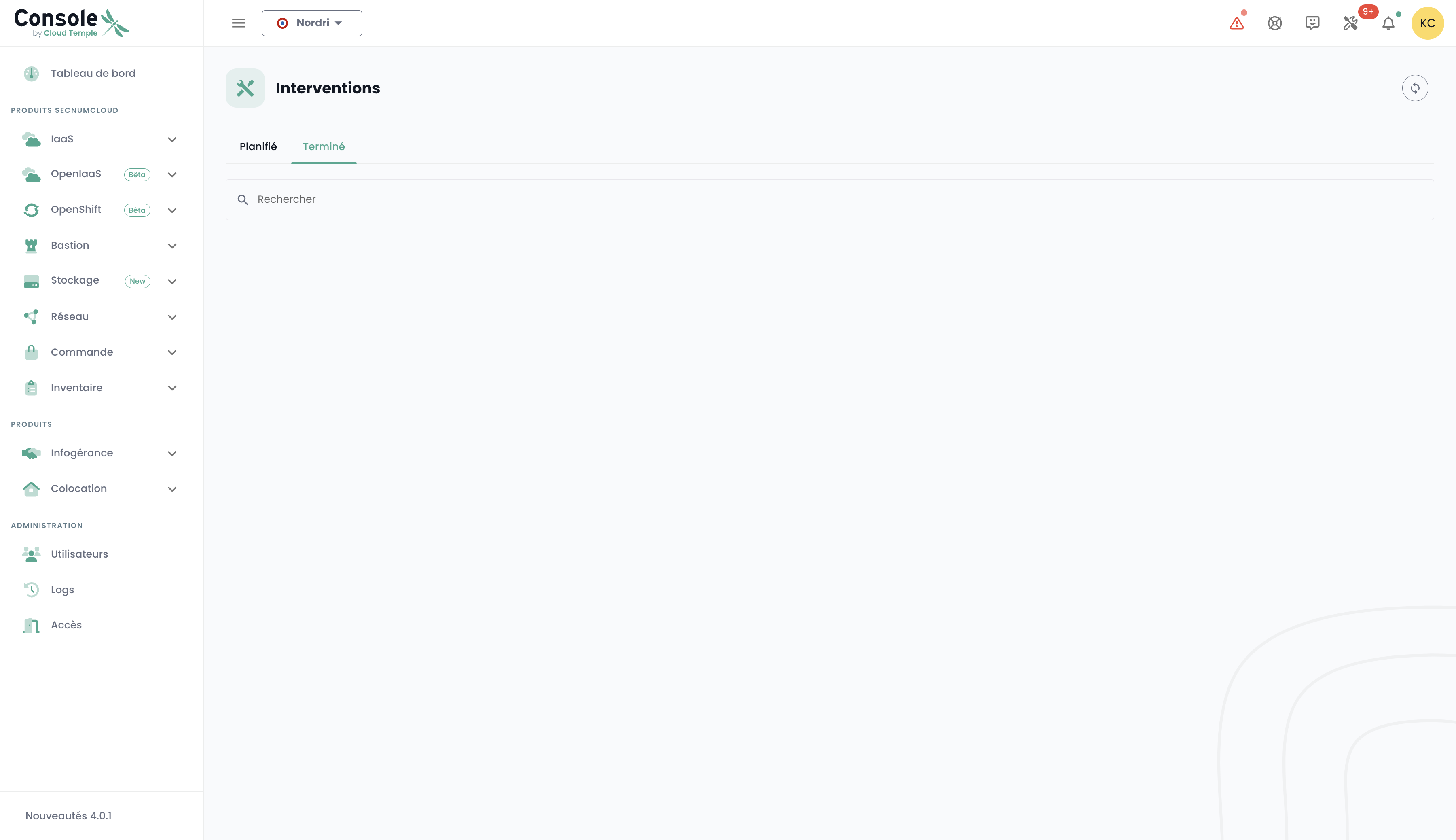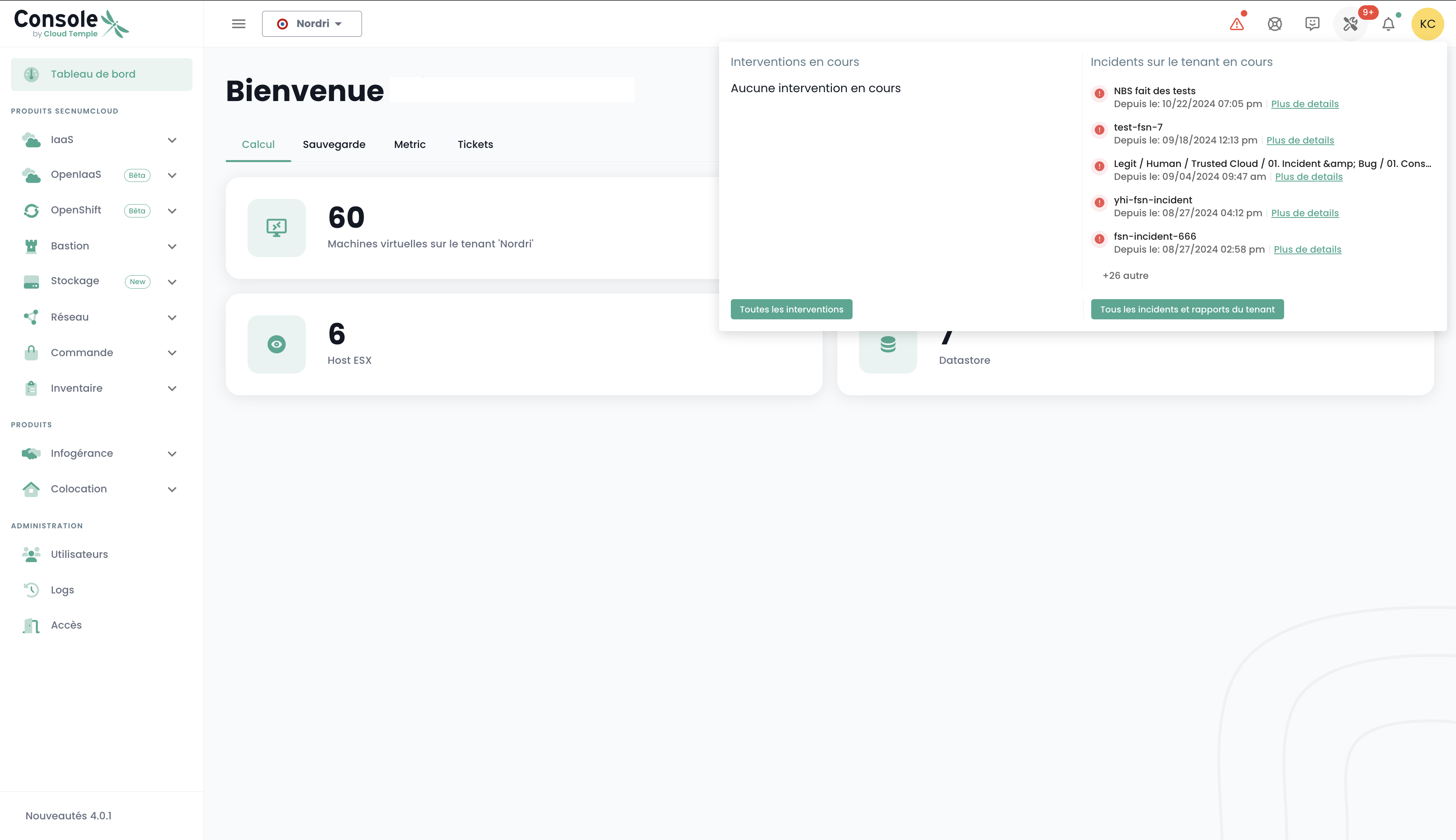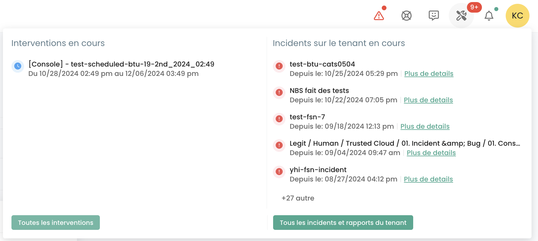 The operations tracking icon allows you to view planned operations on the Cloud Temple infrastructure as well as open incidents on the tenant. This icon is accessible in the icon bar in the upper-left corner of the screen and appears as the 'Tools' icon.