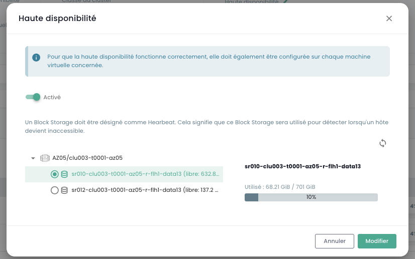Para activar la alta disponibilidad en un pool, debe seleccionar un Block Storage como Heartbeat: