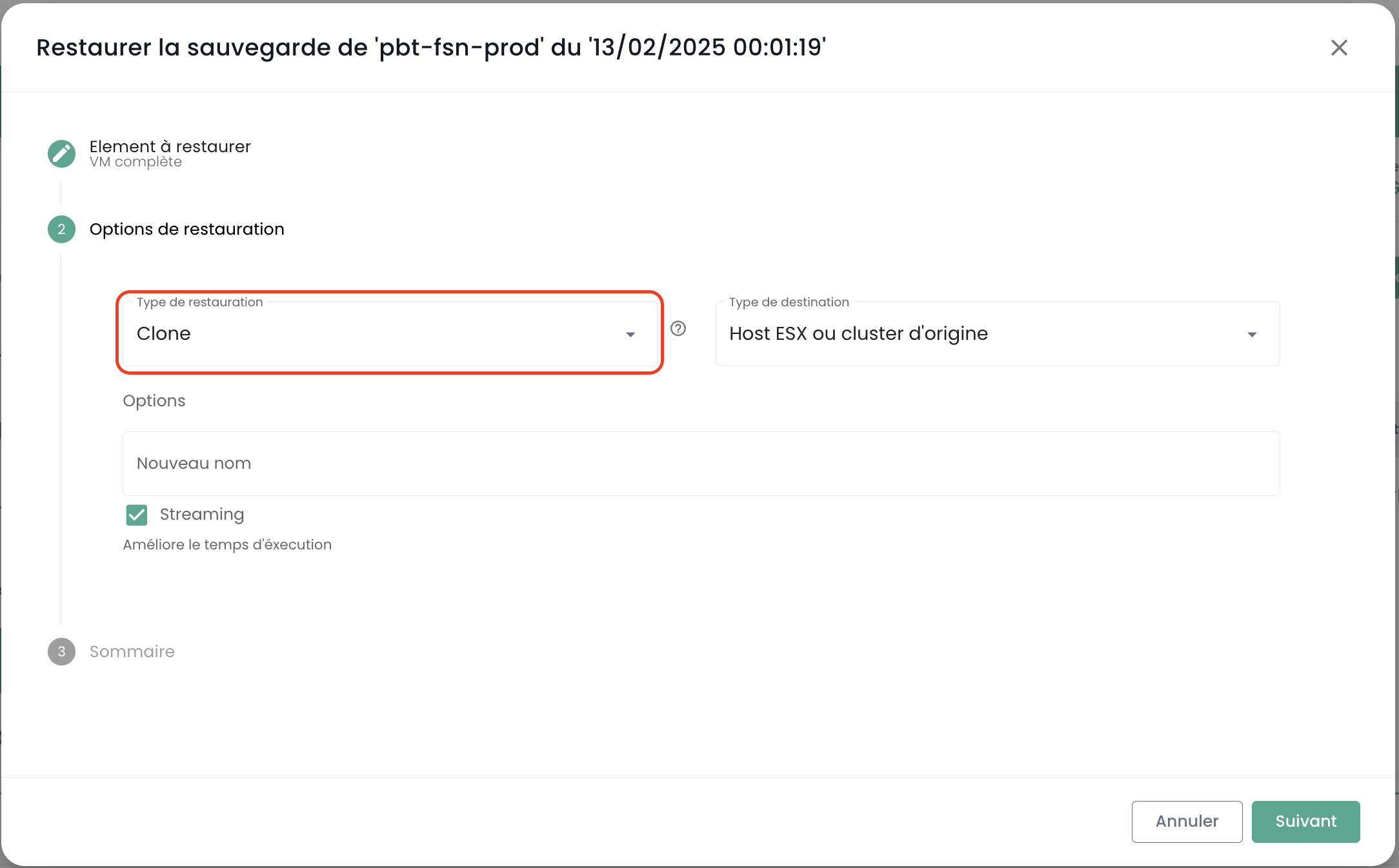 - 'PRODUCCIÓN' : Restaura y reemplaza la máquina virtual de producción (la máquina virtual actualmente en producción se destruye).