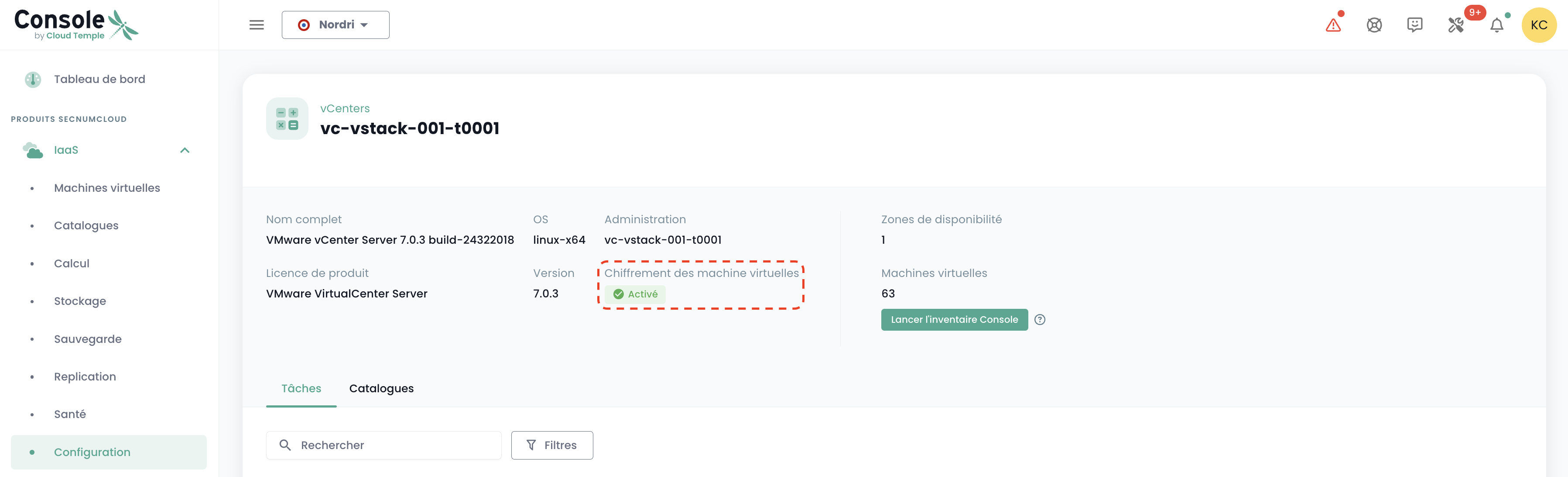 Una vez conectado al portal web Console, desde el menú 'IaaS', submenú 'Configuración' y luego la pestaña 'vCenters', encontrarás la información que indica si el cifrado está activado en la vStack correspondiente.