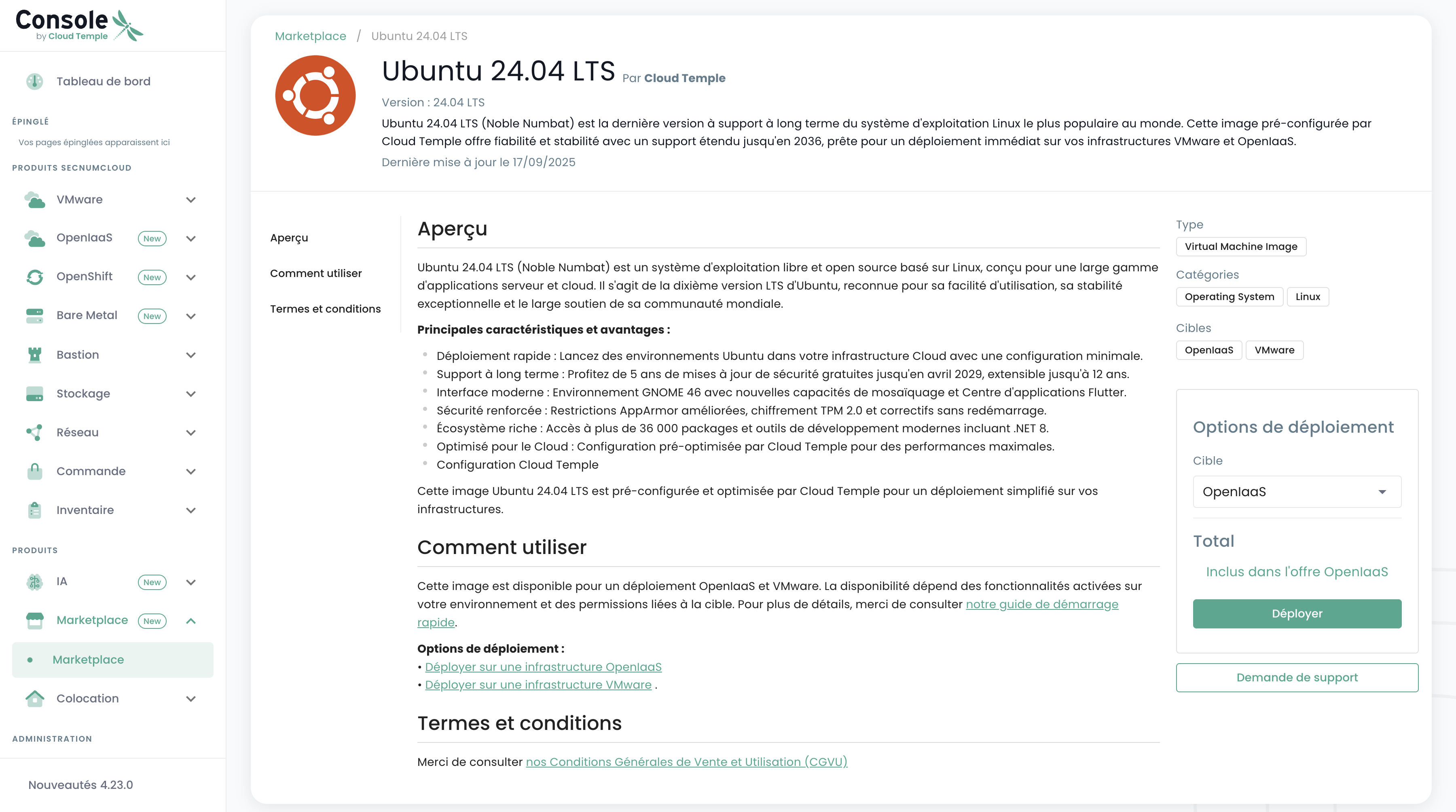 Once logged into the Cloud Temple console, you can access the Marketplace in several ways: