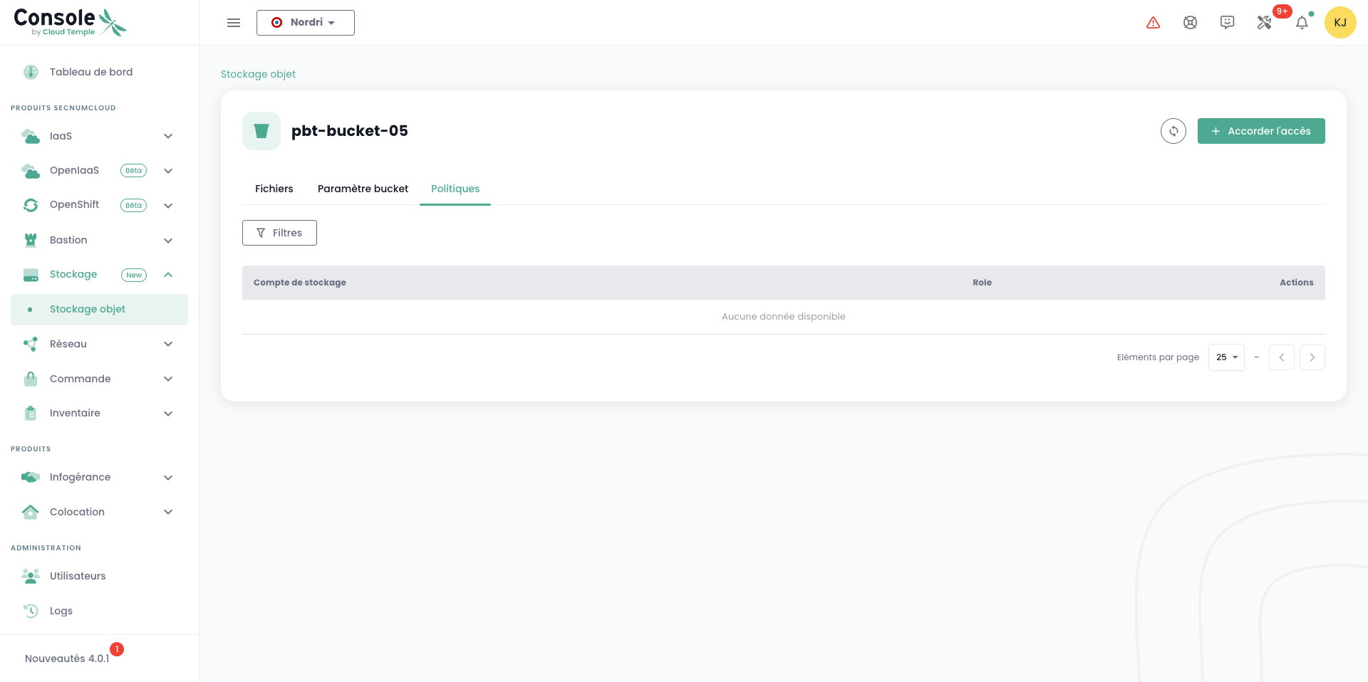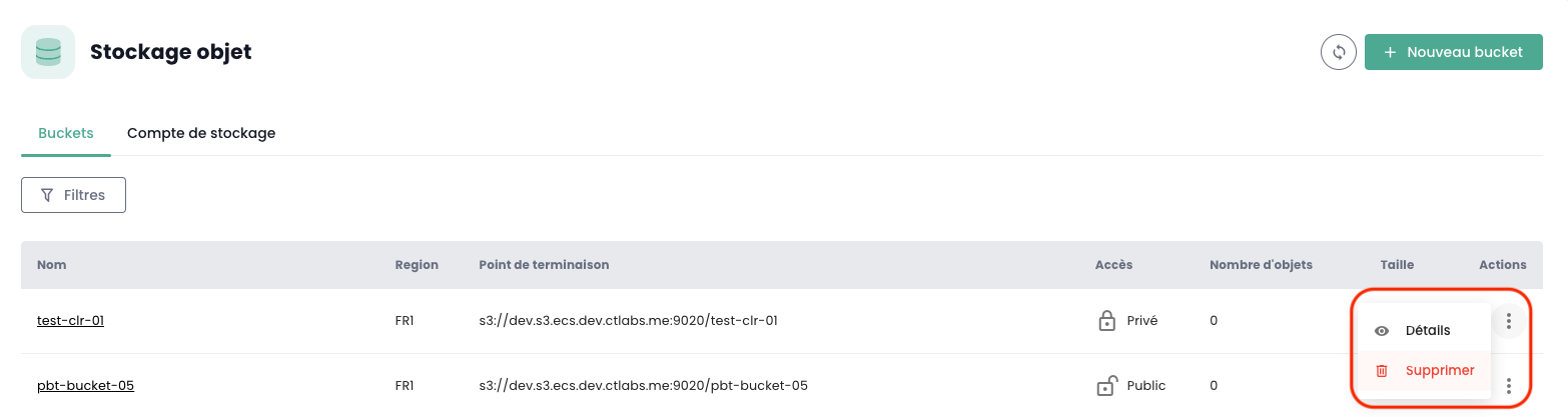 Puede acceder a todos sus buckets a través del menú 'Almacenamiento de objetos' de la consola Cloud Temple: