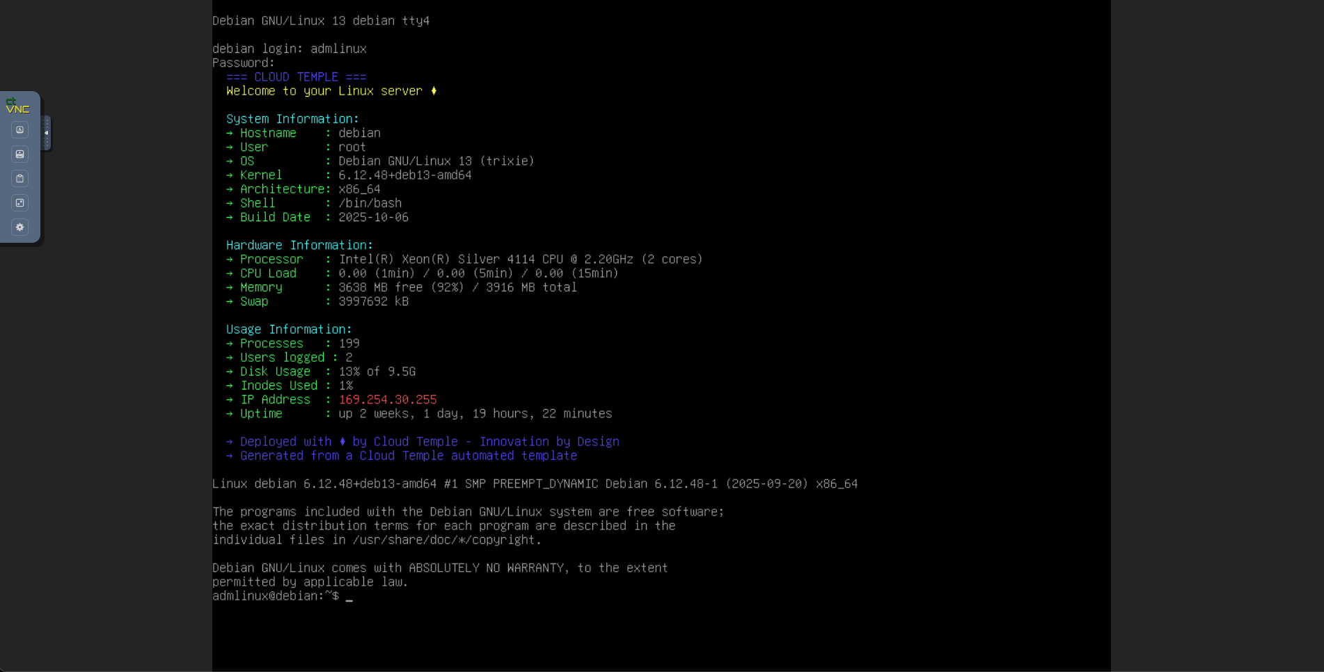 Un nouvel onglet de votre navigateur s'ouvre et s'affiche alors la console de votre machine, basée sur un client VNC :