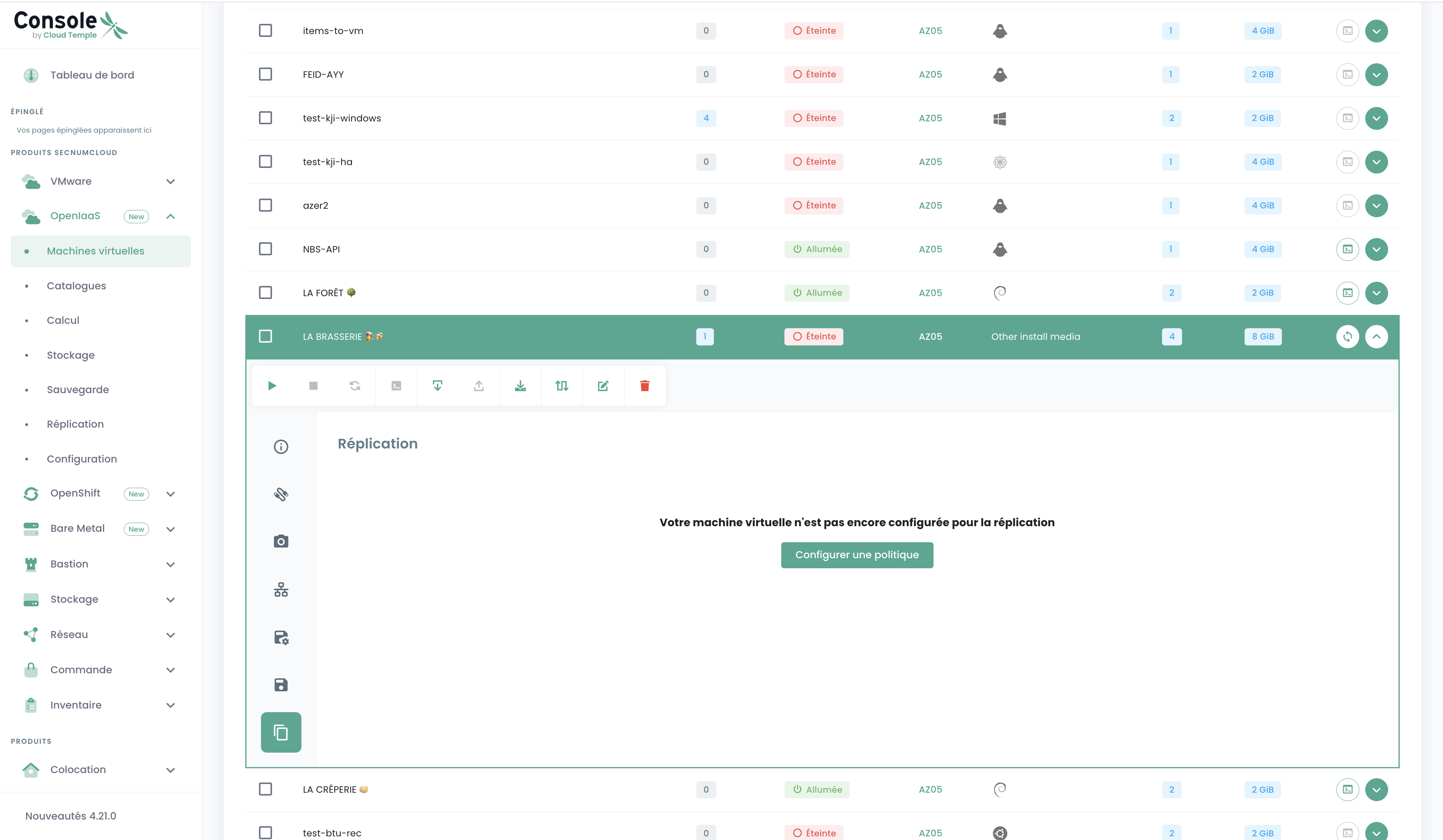 L'interface de gestion de la réplication est disponible dans la Console dans le menu 'OpenIaaS' > 'Réplication' situé sur le bandeau vert à gauche de l'écran.