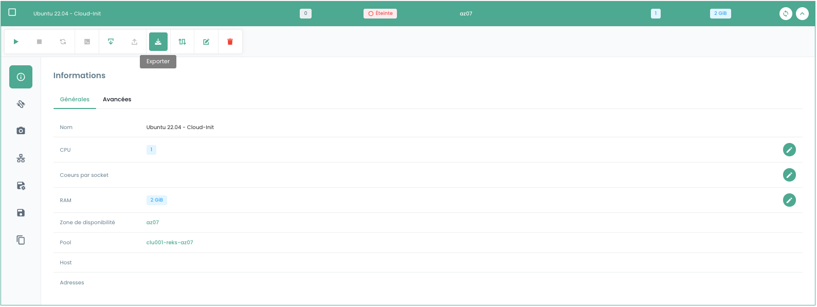 Vous pouvez expoter une machine virtuelle en cliquant sur l'icône 'Exporter' :