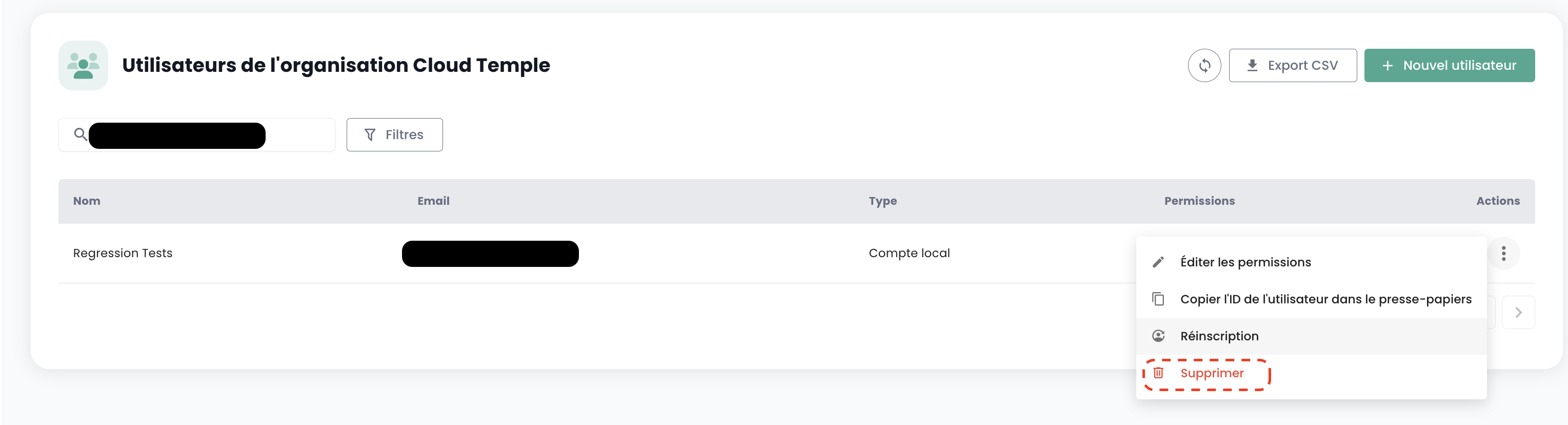 Seleziona l'utente che desideri eliminare, quindi fai clic sul pulsante di azione in fondo alla riga e seleziona 'Elimina'.