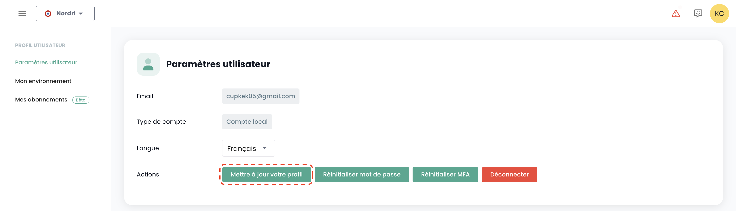 Seleziona 'Profilo' in alto a destra dello schermo, quindi 'Impostazioni utente' e seleziona l'azione 'Aggiorna il tuo profilo'.