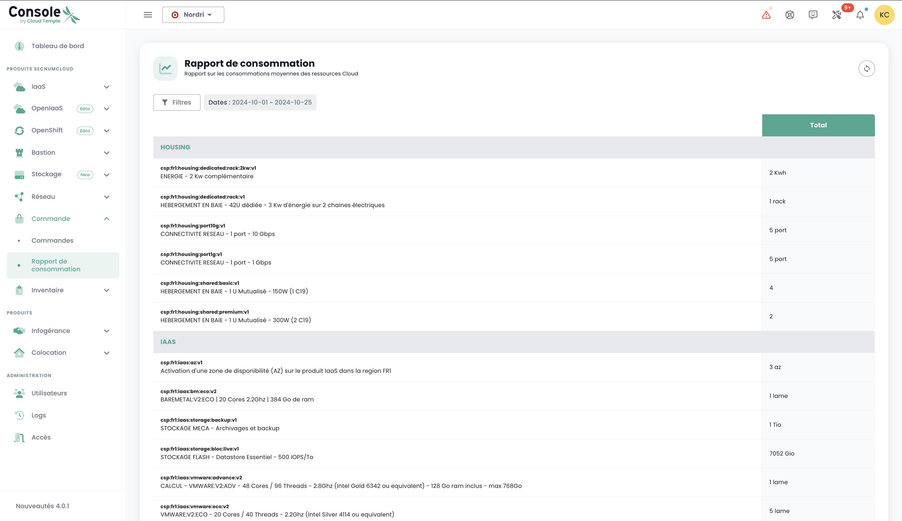 Nel menu della console, fare clic su "Report di consumo" e selezionare il periodo di tempo desiderato. Potrai quindi visualizzare in dettaglio il consumo delle risorse cloud nel periodo specificato, consentendoti di analizzare l'utilizzo dei servizi e ottimizzare la gestione di conseguenza: