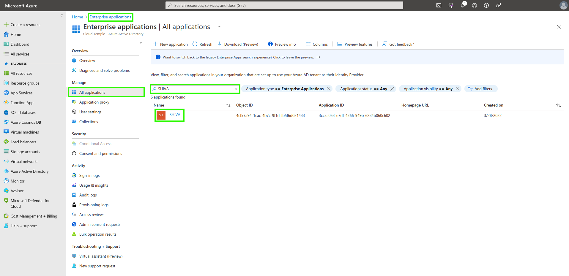 Passare alle "Applicazioni aziendali" e cercare utilizzando il nome dell'applicazione creata in precedenza.