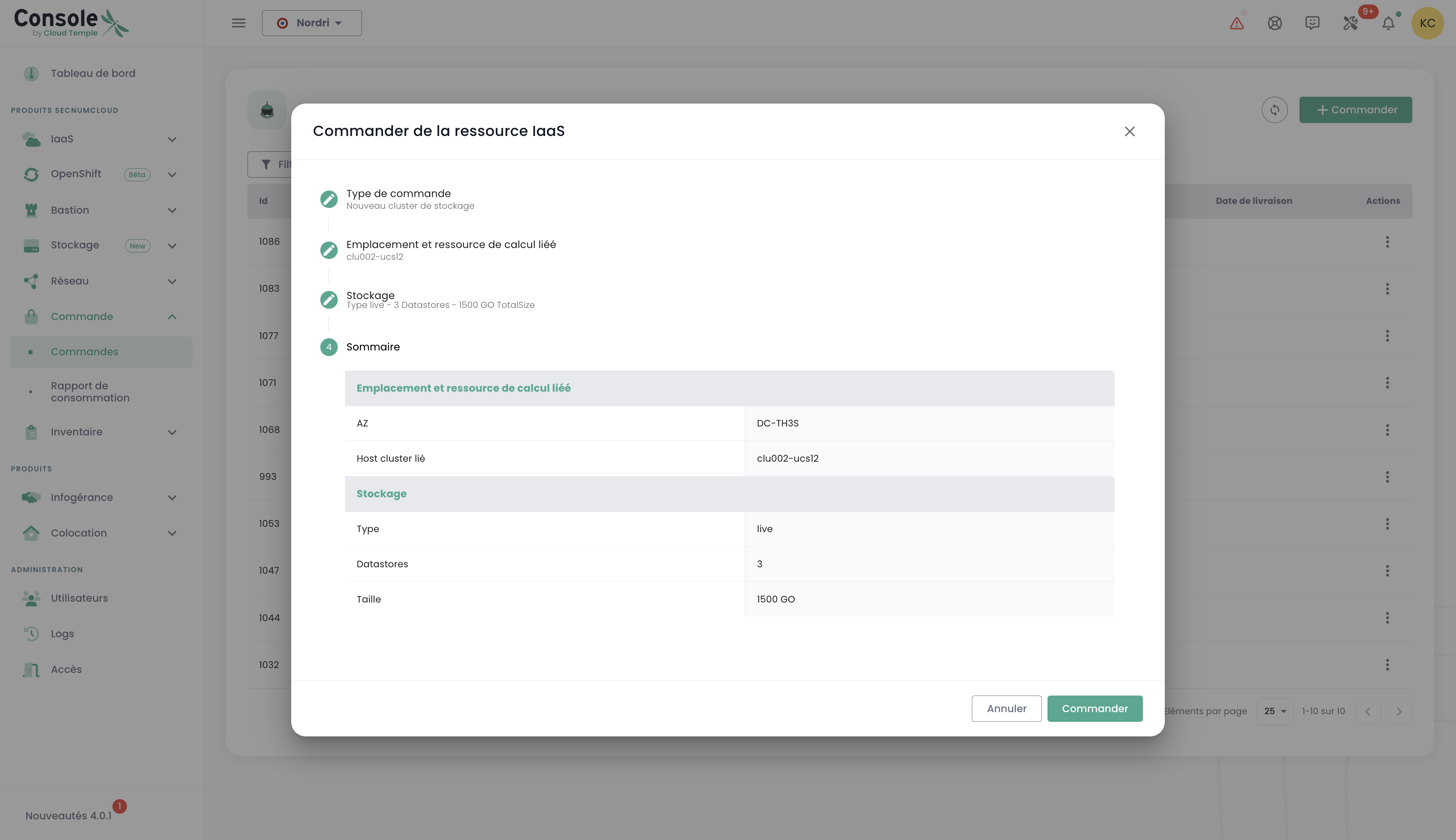 Nel menu "comando", effettua l'ordine di un nuovo cluster di archiviazione per il tuo ambiente selezionando le opzioni che corrispondono ai tuoi requisiti in termini di capacità, prestazioni e ridondanza. Seleziona la posizione: