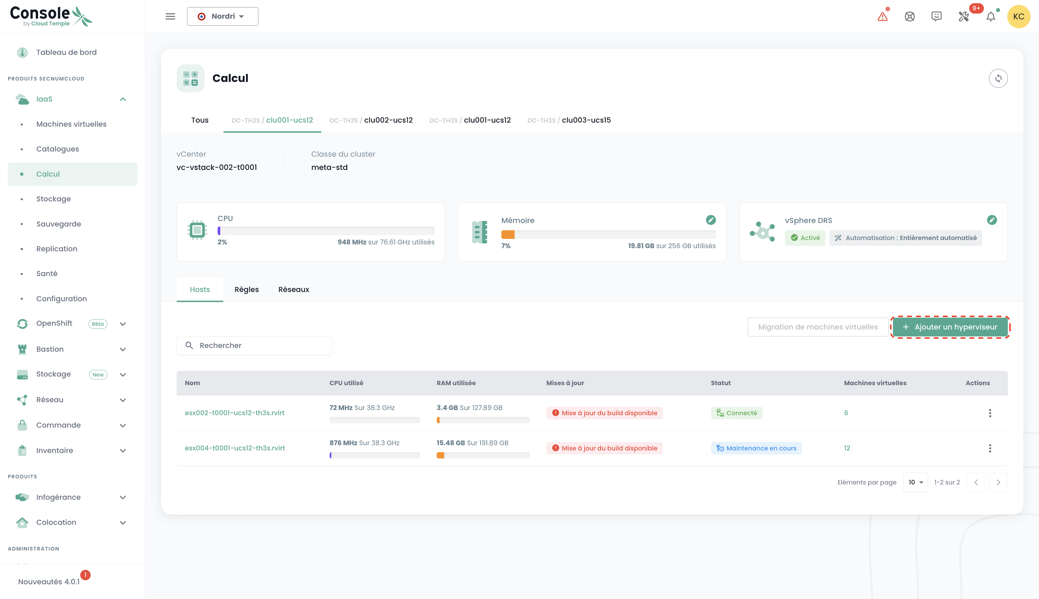 L'aggiunta di hypervisor a un cluster di calcolo avviene nel menu 'IaaS' nella barra verde a sinistra dello schermo.