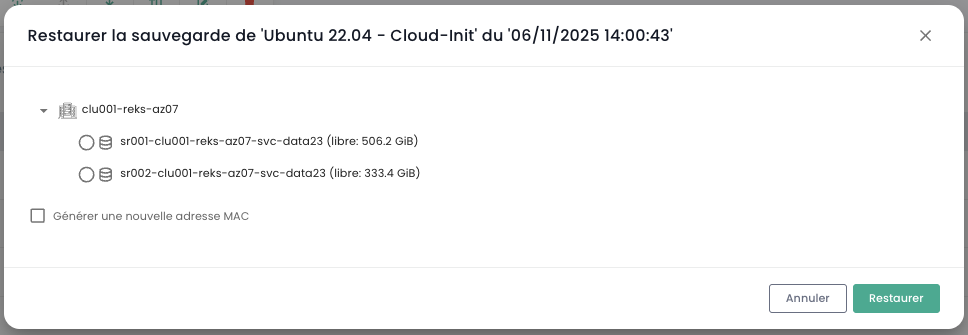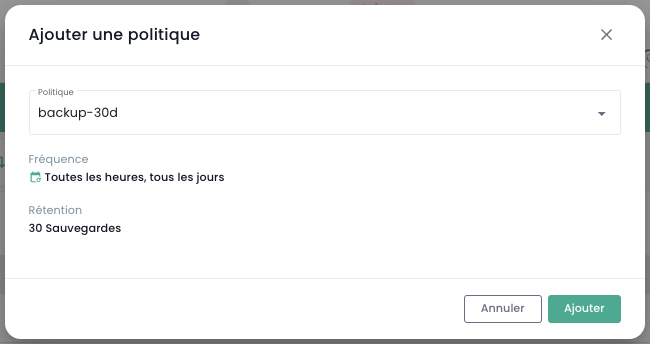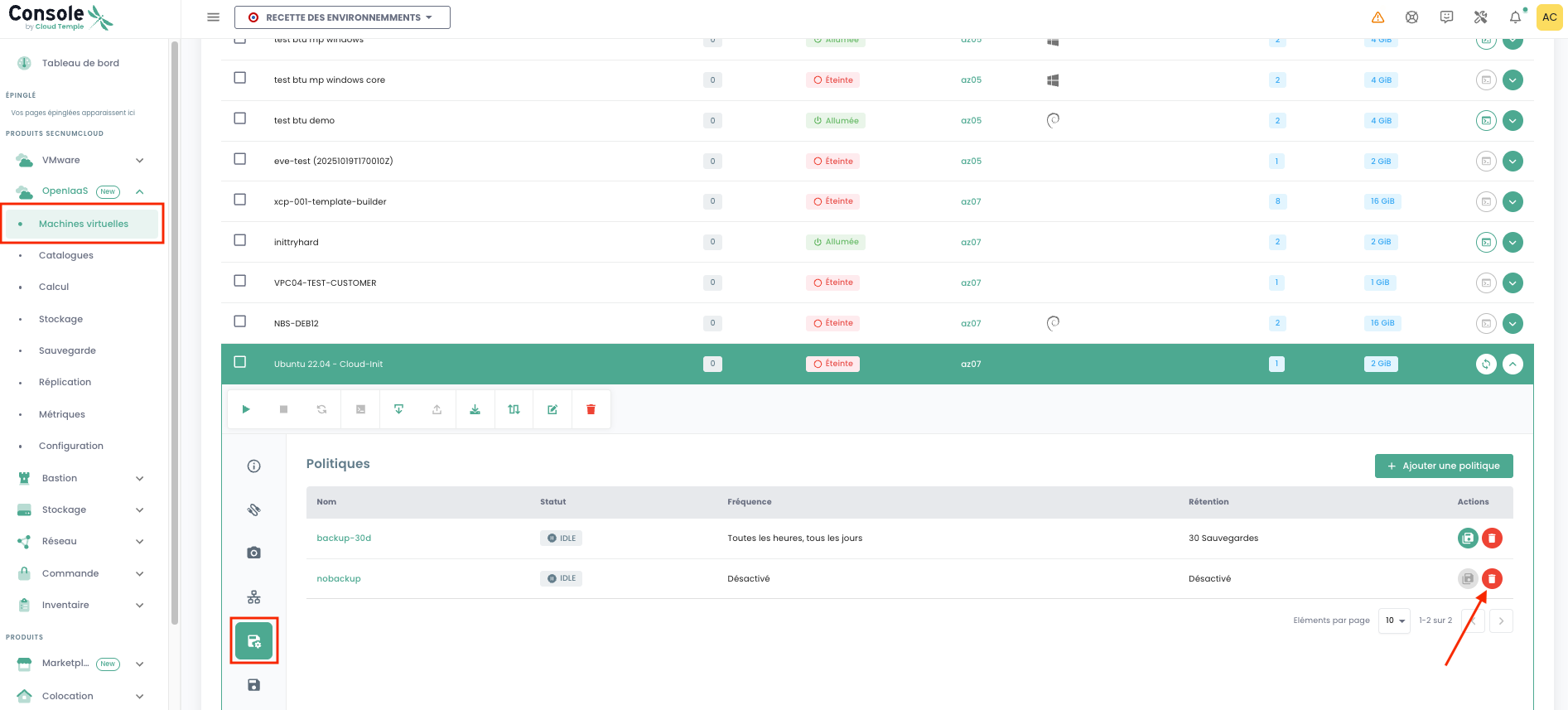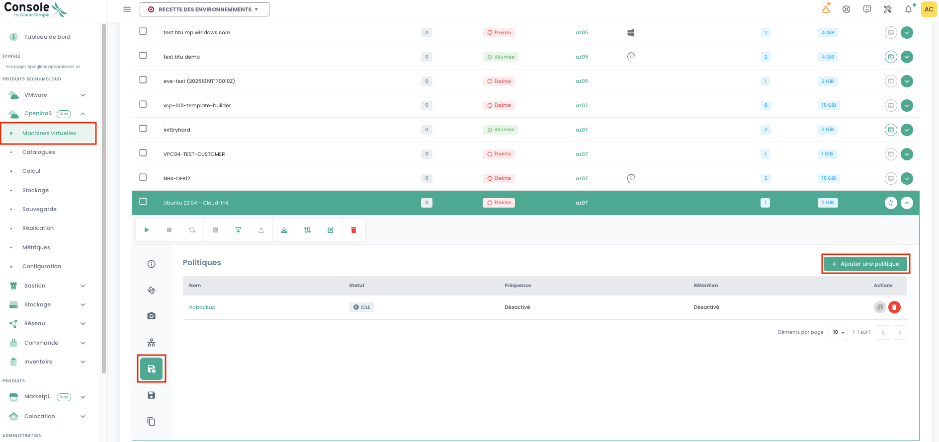 Nota: Attenzione! SecNumCloud richiede che ogni macchina virtuale abbia almeno una politica di backup assegnata.