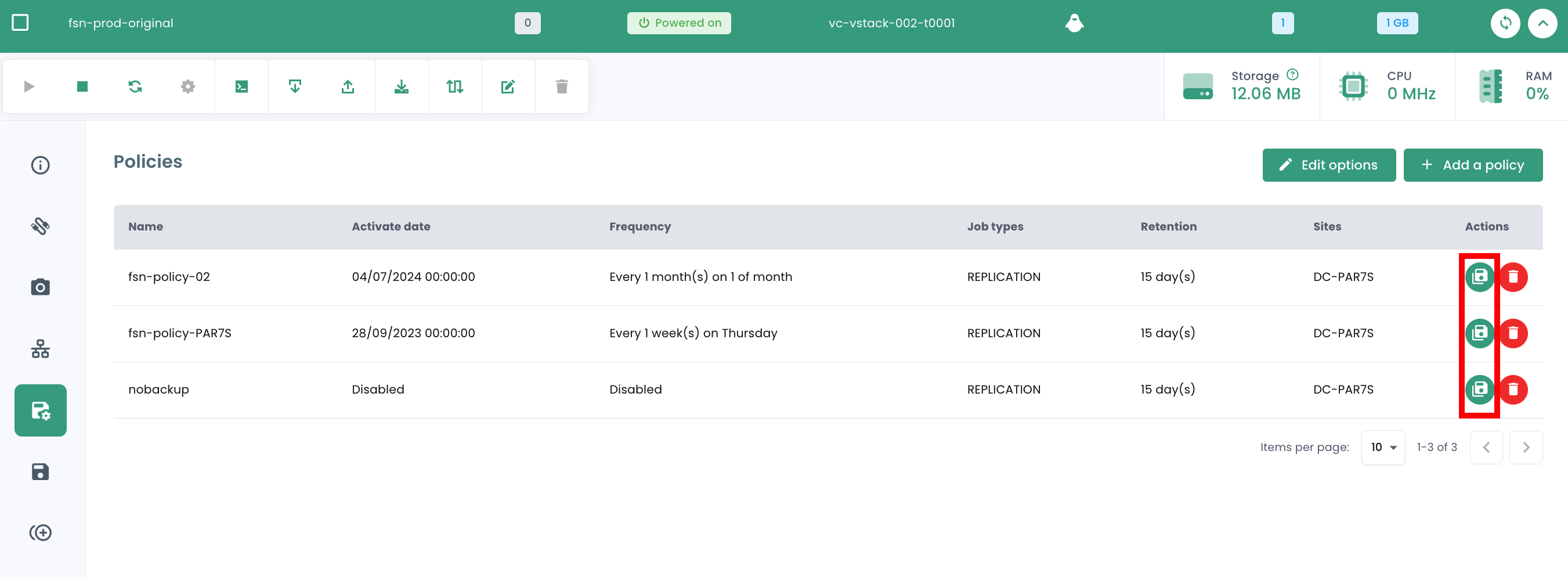 Nel menu 'Politiche di backup' della tua macchina virtuale, fai clic sul pulsante 'Esegui' nella colonna 'Azioni' della politica di backup che desideri eseguire.