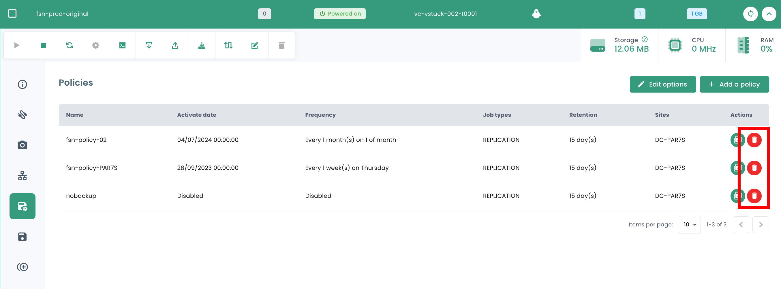 Nel menu 'Politiche di backup' della tua macchina virtuale, fai clic sul pulsante 'Rimuovi' nella colonna 'Azioni' della politica di backup che desideri rimuovere.