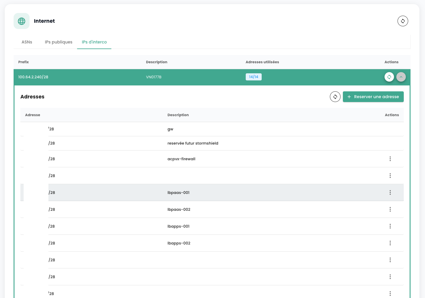 Allo stesso modo, potete visualizzare e commentare i blocchi di indirizzi IP di interconnessione. Potete visualizzare le sottoreti di interconnessione con la rete Cloud Temple e il loro utilizzo:
