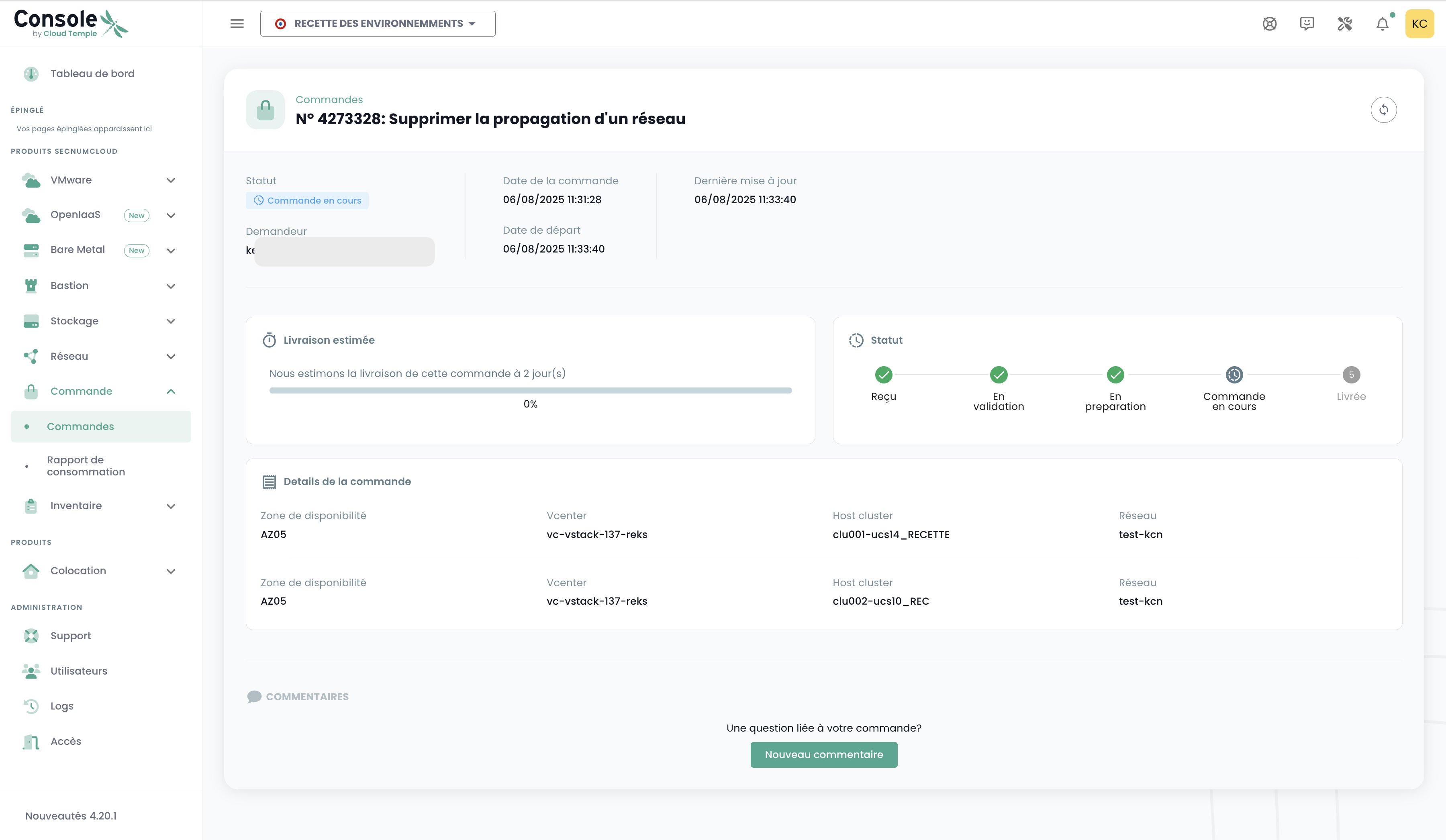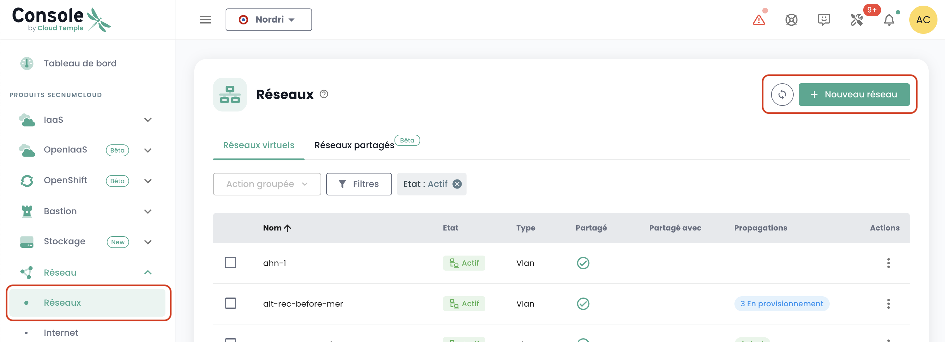 L'esecuzione delle richieste di reti private all'interno di una regione avviene direttamente nella console Cloud Temple.
