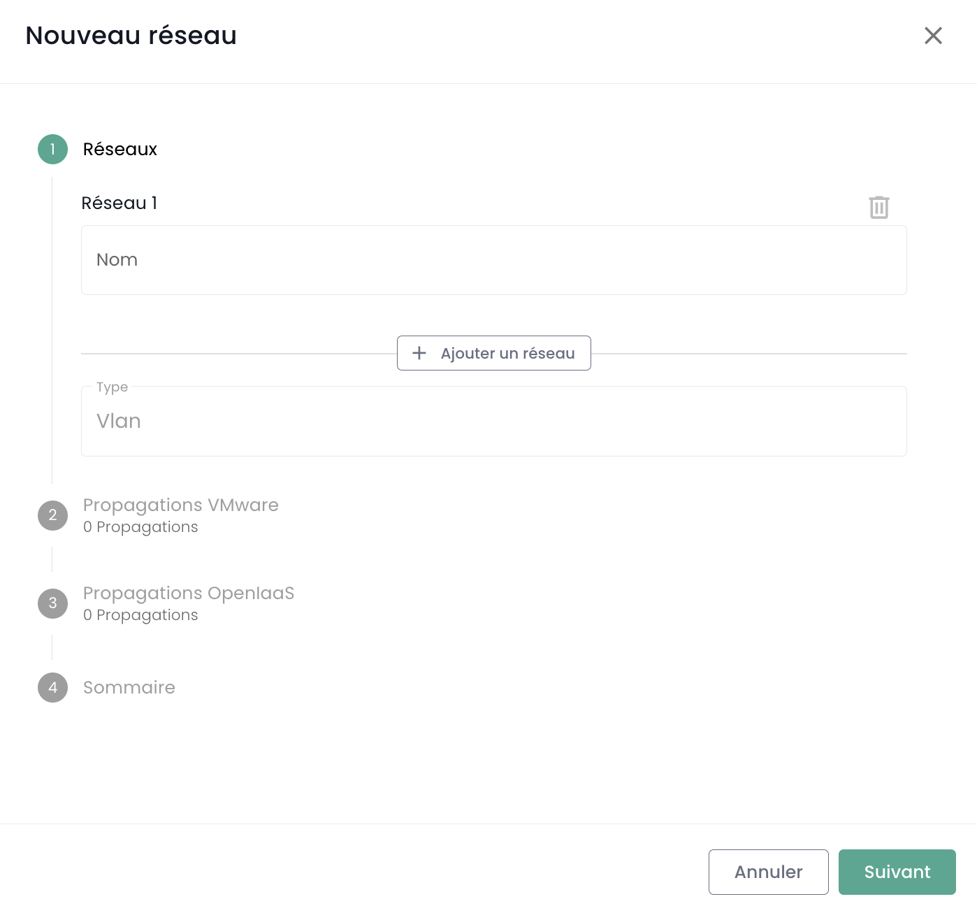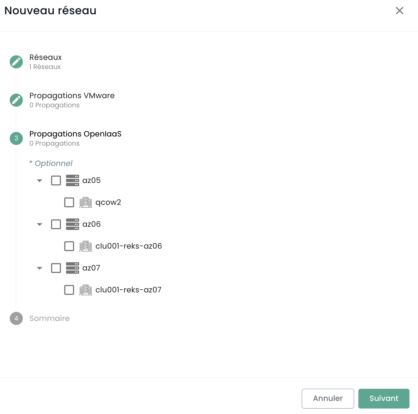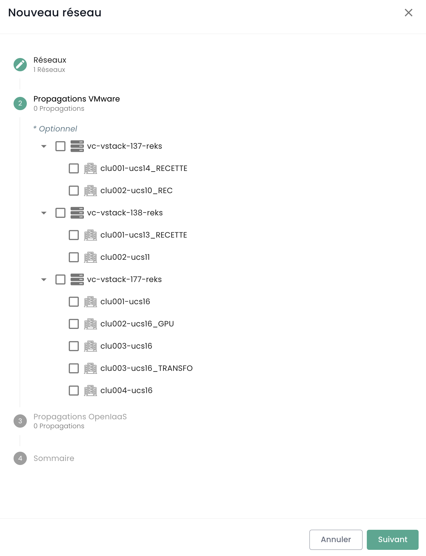 Choisissez ensuite vers quel produit (IaaS VMware, Open IaaS, Bare metal) vous souhaitez propager vos réseaux, puis les clusters devant être intégrés à cette propagation.