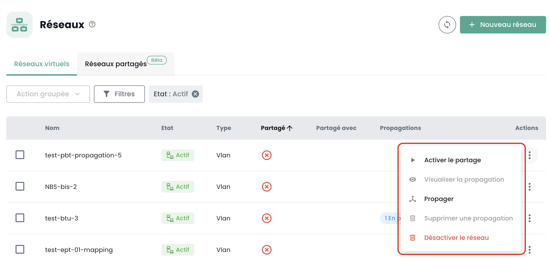- Propager un réseau existant : Cliquez sur l'action Propager sur un réseau déjà créé