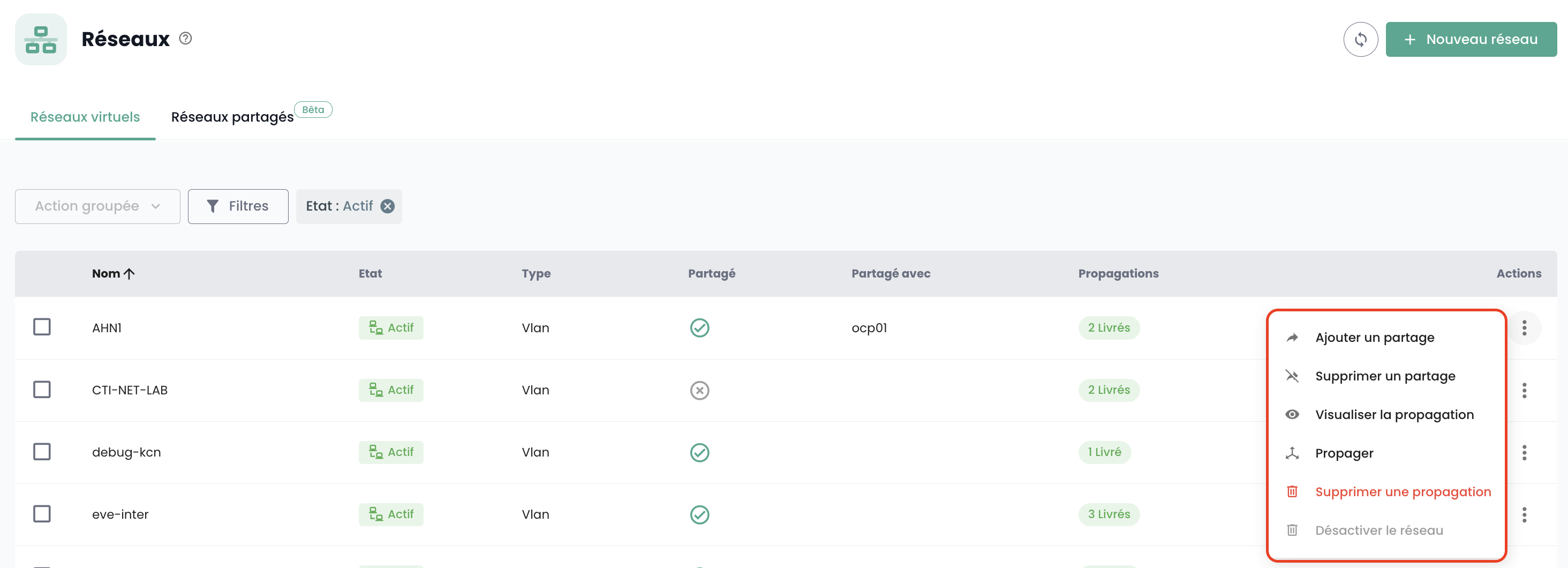 L'ensemble des actions possibles sur vos réseaux se trouve dans le menu Actions de chacun d'eux :